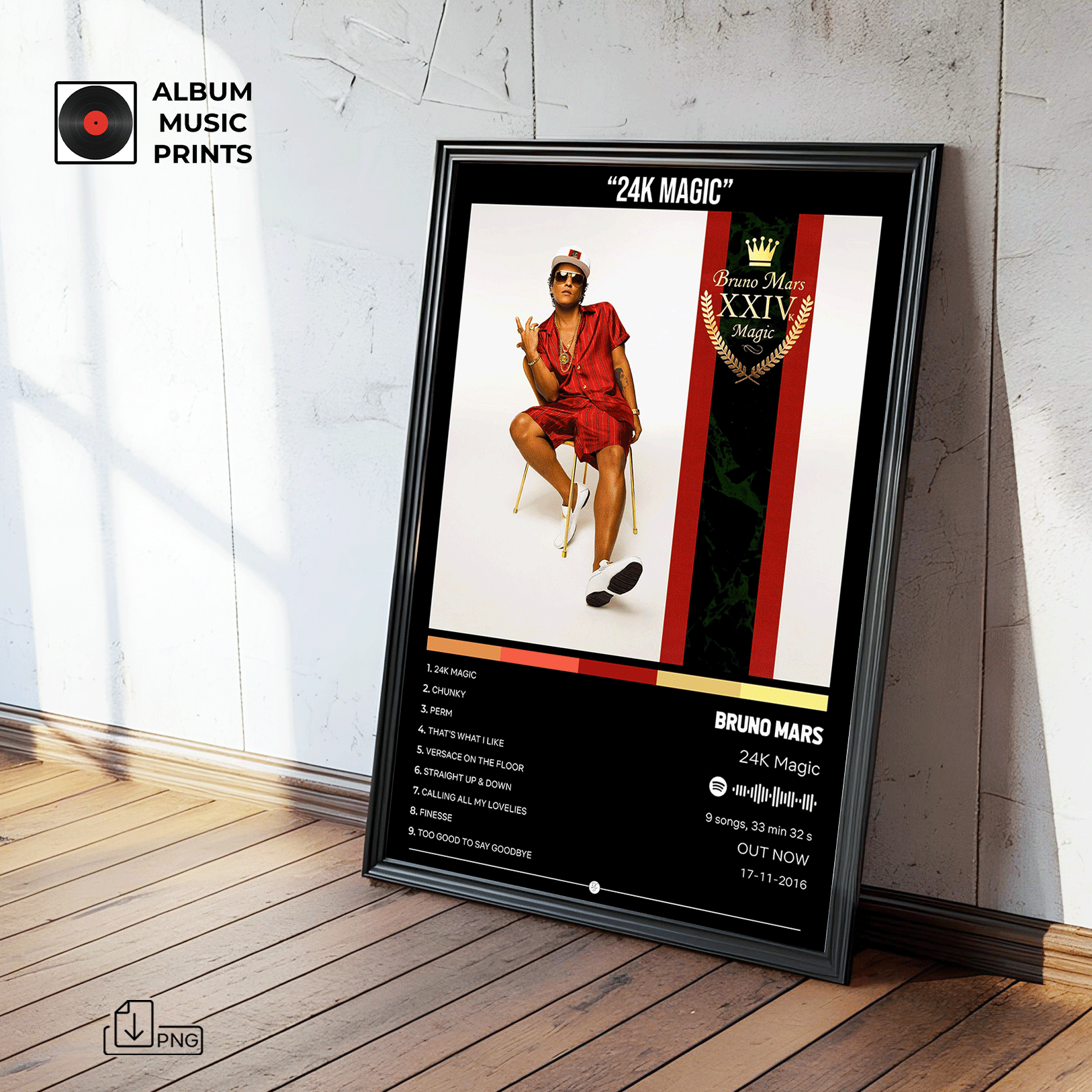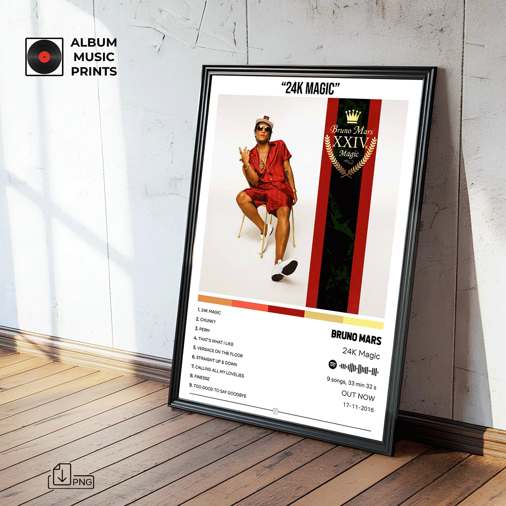 Descarga instantánea de arte digital de alta calidad del icónico álbum 24K Magic de Bruno Mars. Perfecto para fans, coleccionistas y decoradores que buscan capturar la energía y el estilo único de este álbum ganador de múltiples premios Grammy.