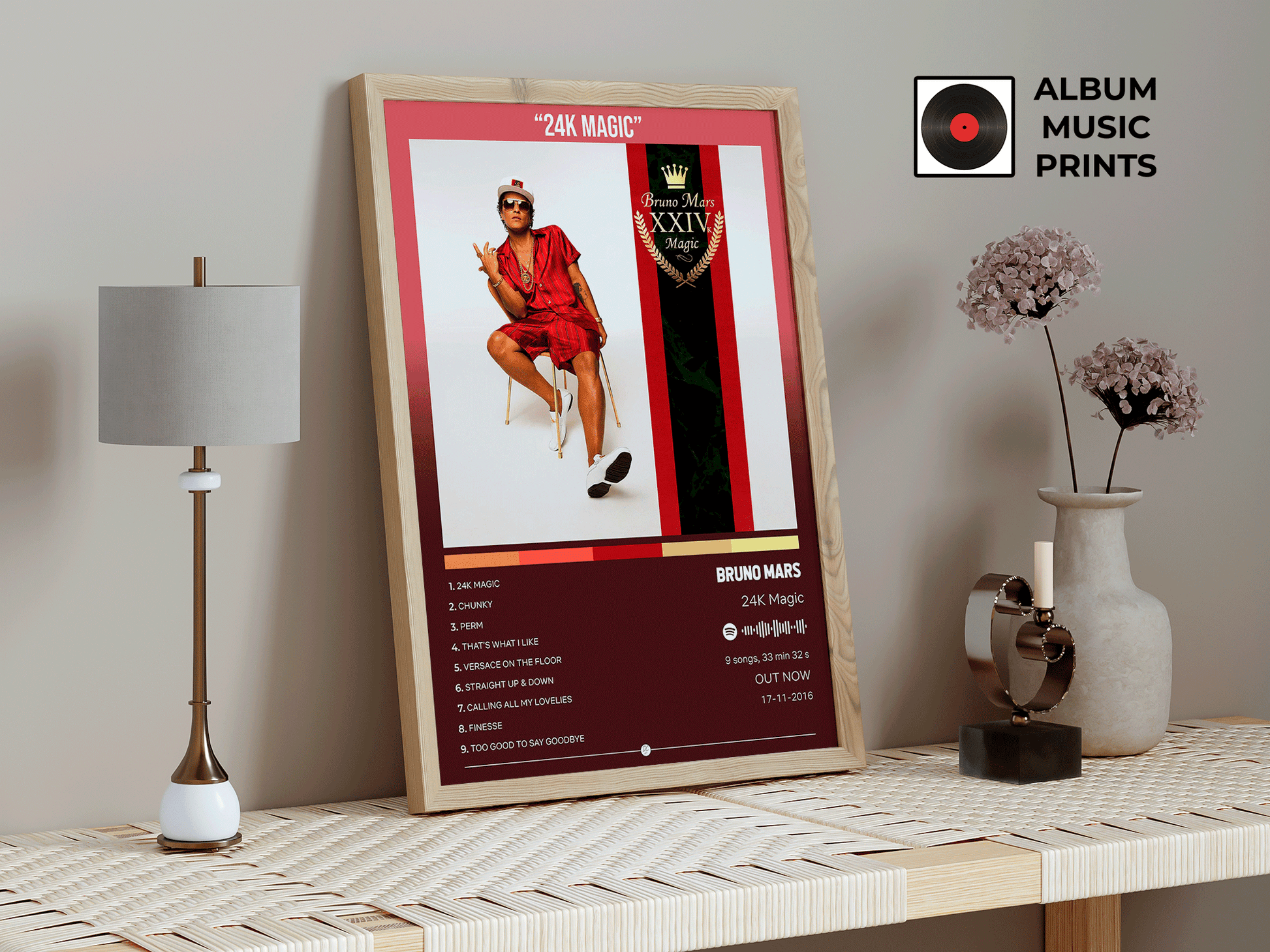 Arte oficial del álbum que conquistó el mundo con hits como "24K Magic", "That's What I Like" y "Finesse". Diseño vibrante y lleno de estilo que captura la esencia funky y retro de Bruno Mars. Ideal para enmarcar y decorar tu espacio con energía positiva y buen gusto musical.