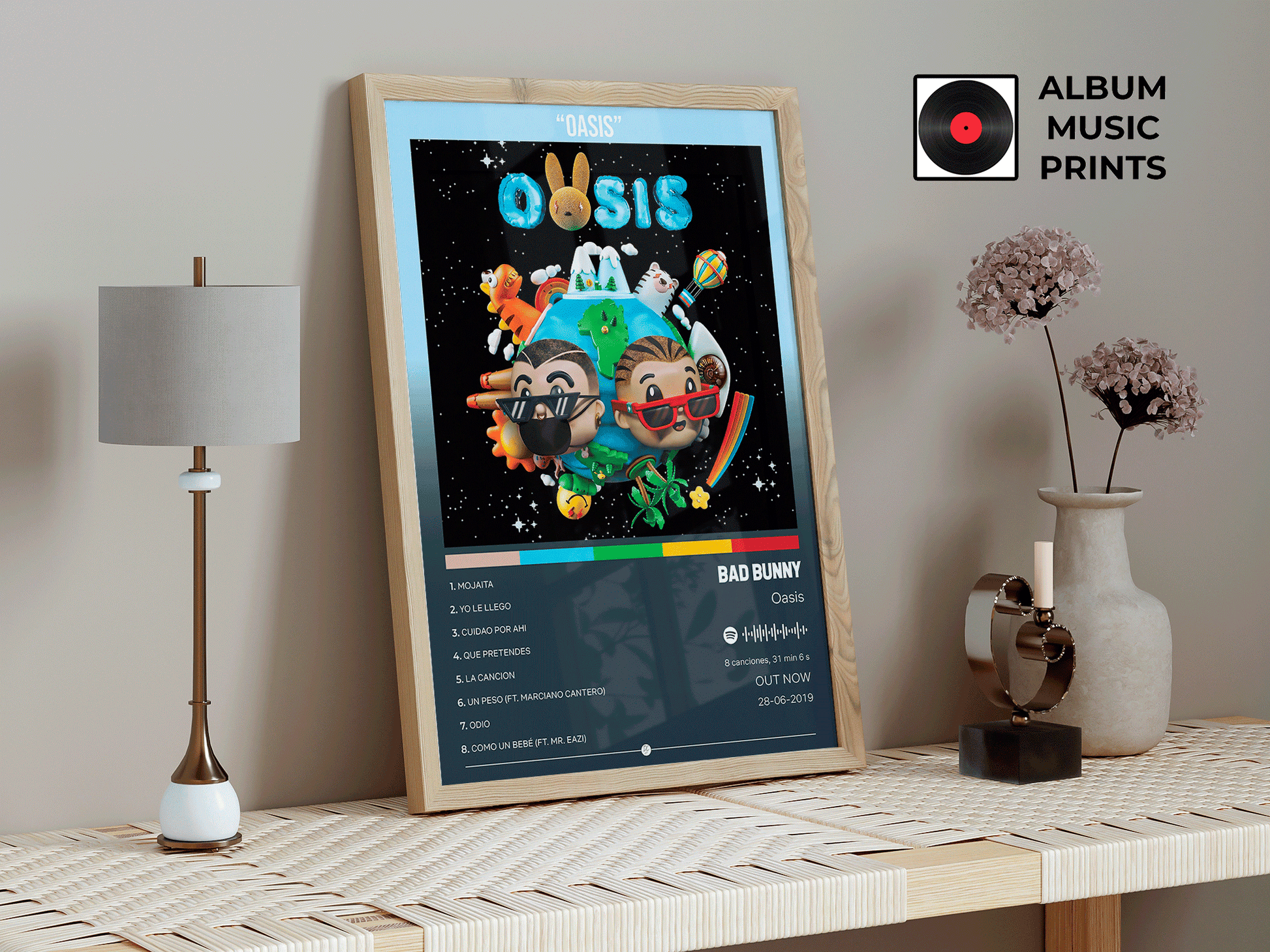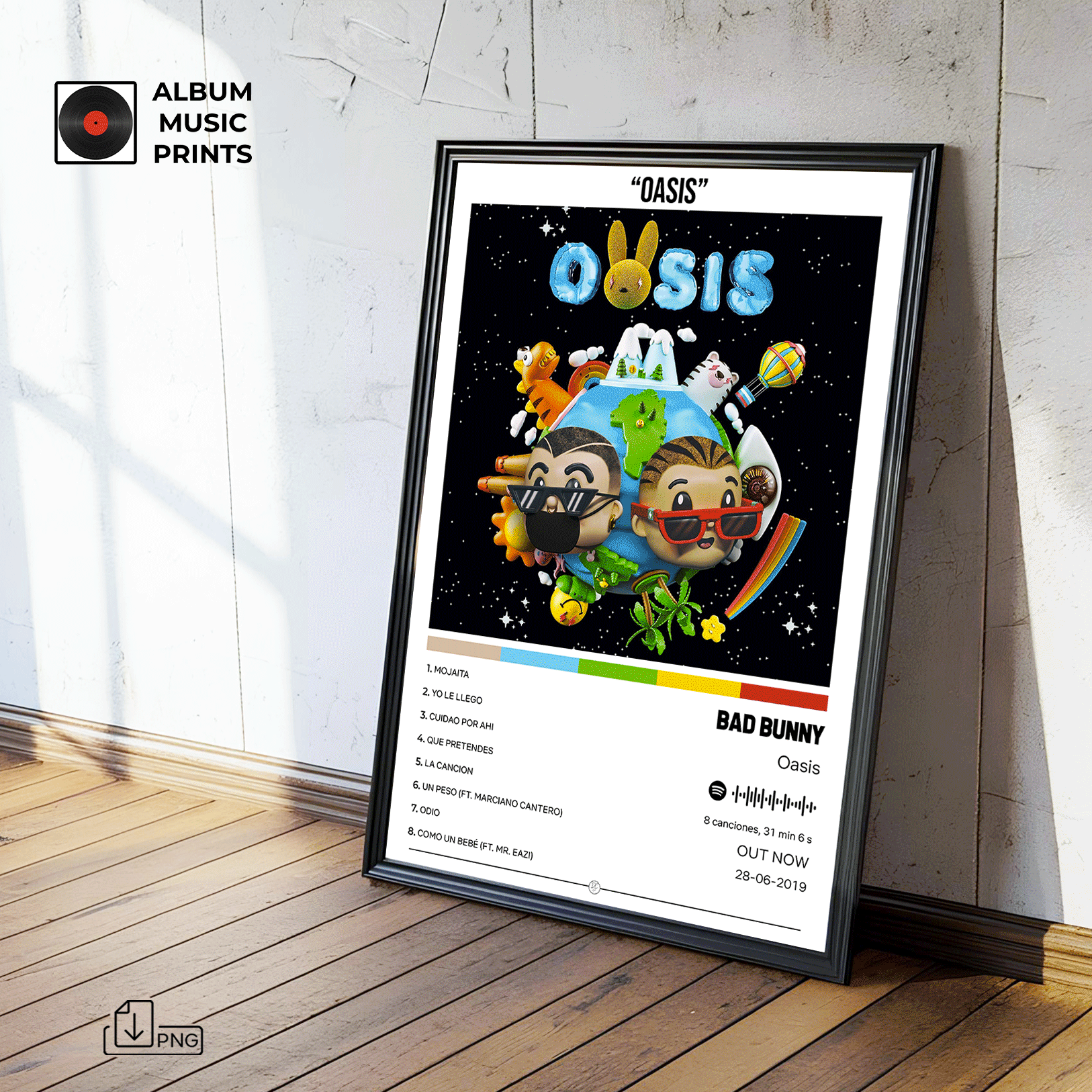 Descarga instantánea del poster del álbum OASIS de Bad Bunny. Perfecto para decorar tu espacio con el arte del último álbum del conejo malo.
