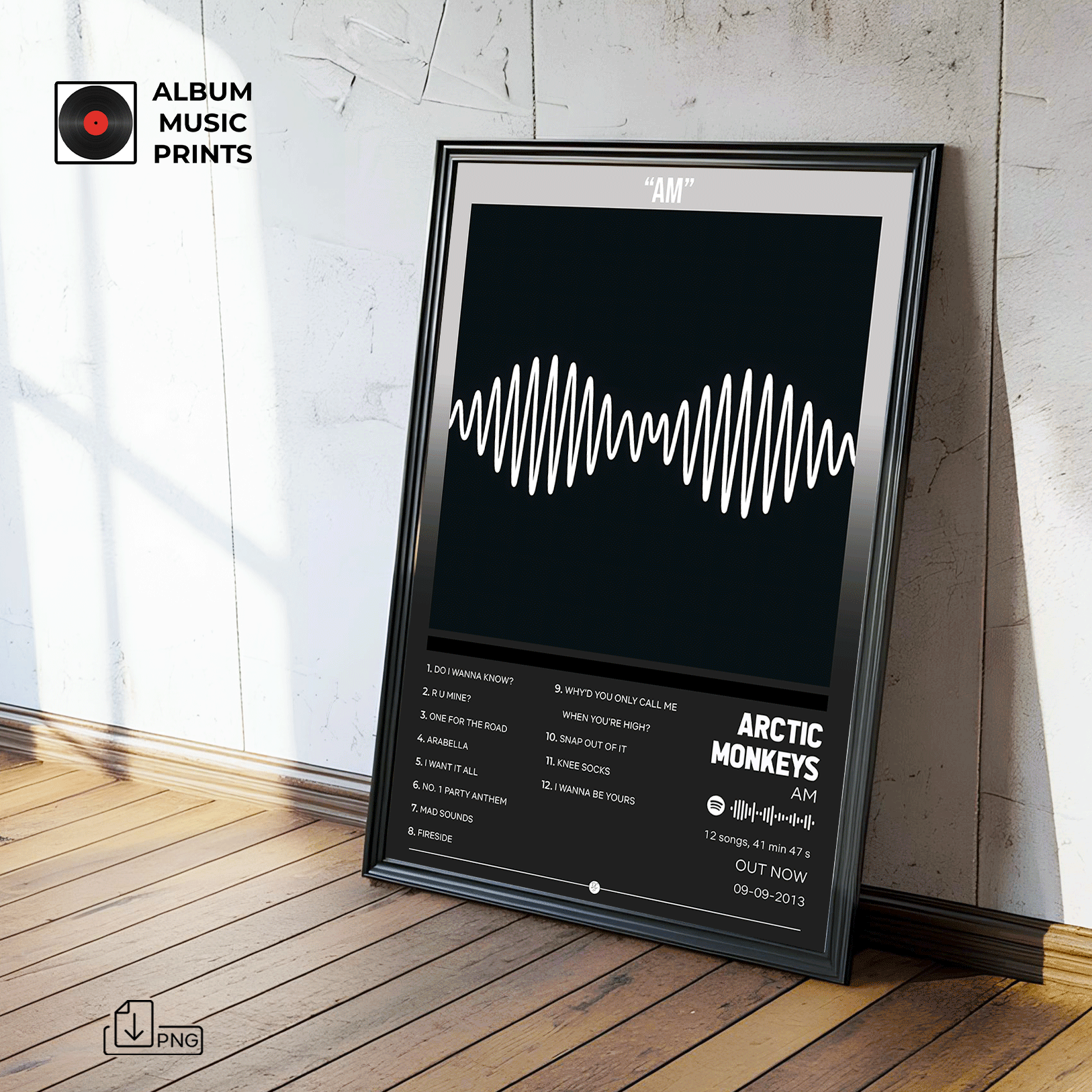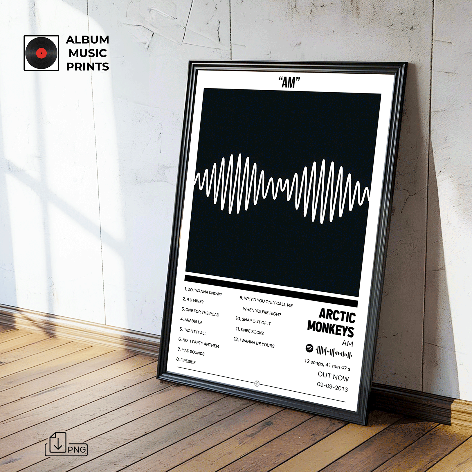 Descarga el póster digital del álbum AM de Arctic Monkeys, una de las obras más icónicas del indie rock moderno. Este diseño captura la estética minimalista y sofisticada del quinto álbum de estudio de la banda británica, lanzado en 2013.