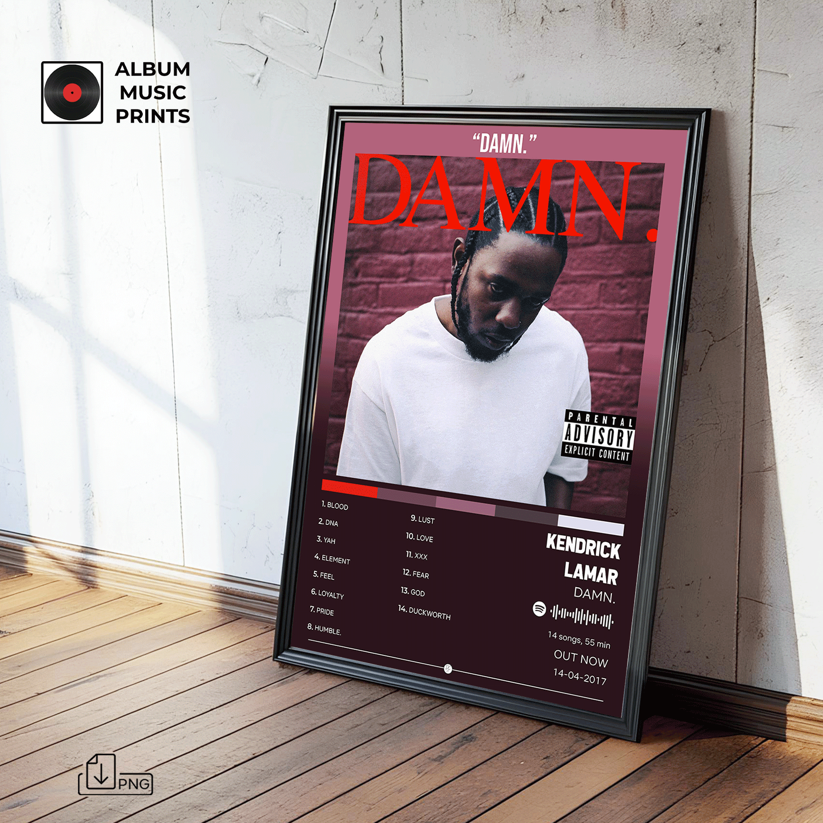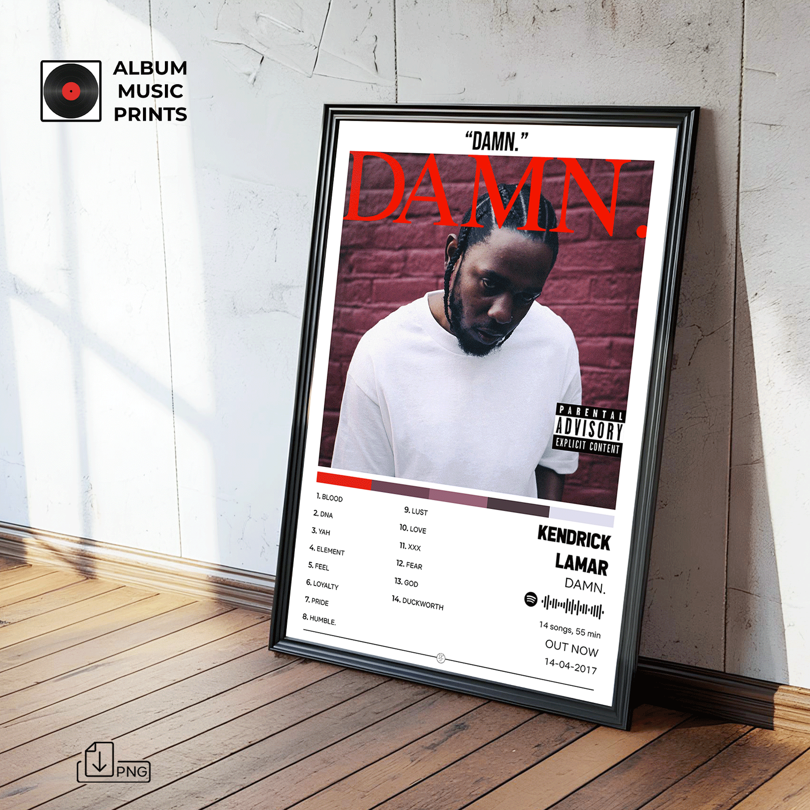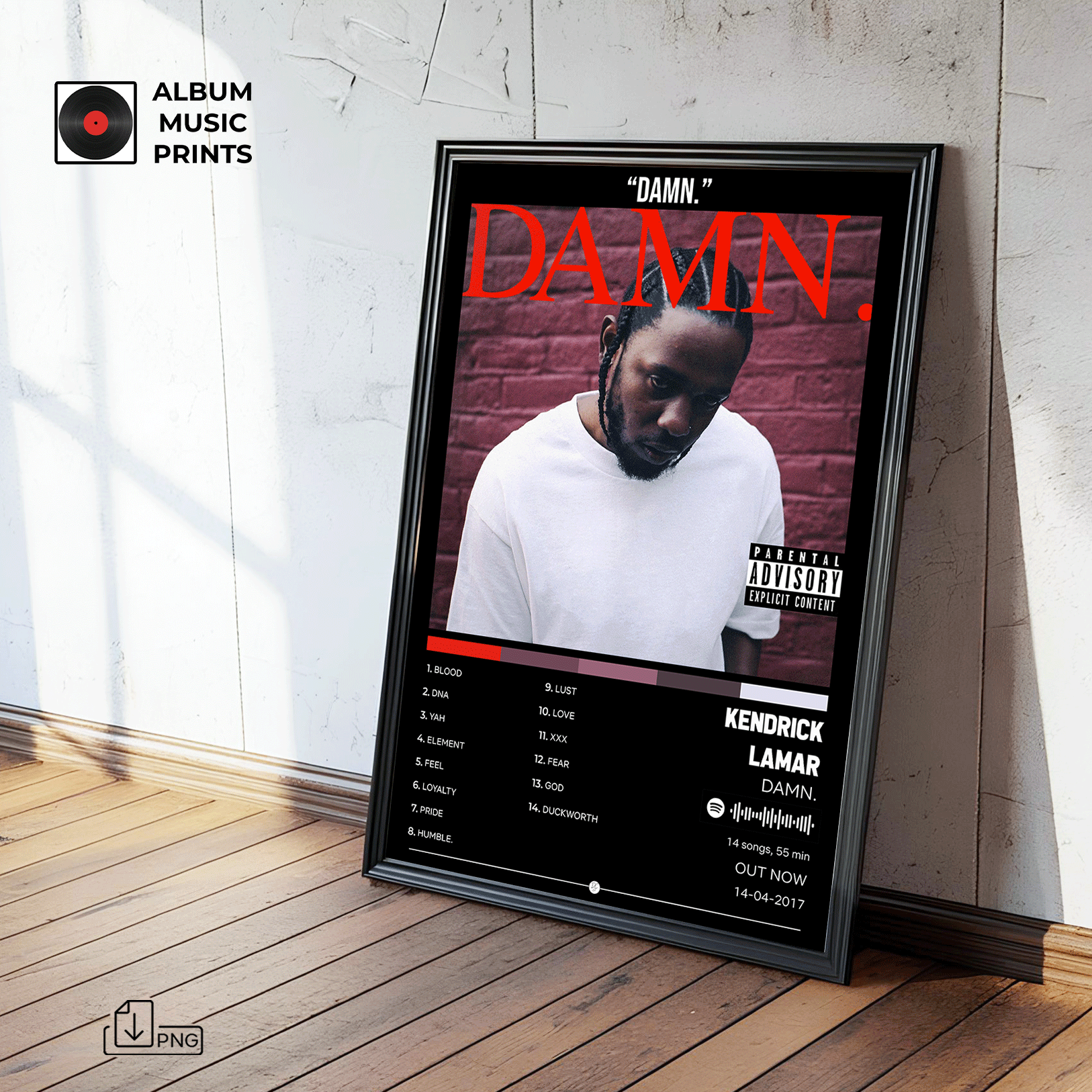 Descarga el póster digital del icónico álbum DAMN de Kendrick Lamar, ganador del Premio Pulitzer y uno de los discos más influyentes del hip-hop contemporáneo. Este diseño captura la esencia cruda y poderosa de un álbum que redefinió el rap moderno con tracks como HUMBLE, DNA y LOYALTY.