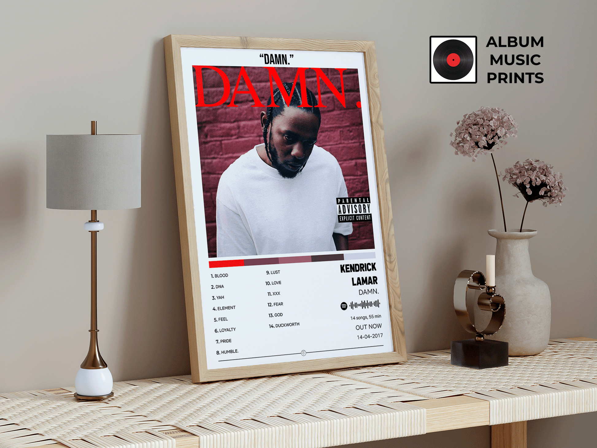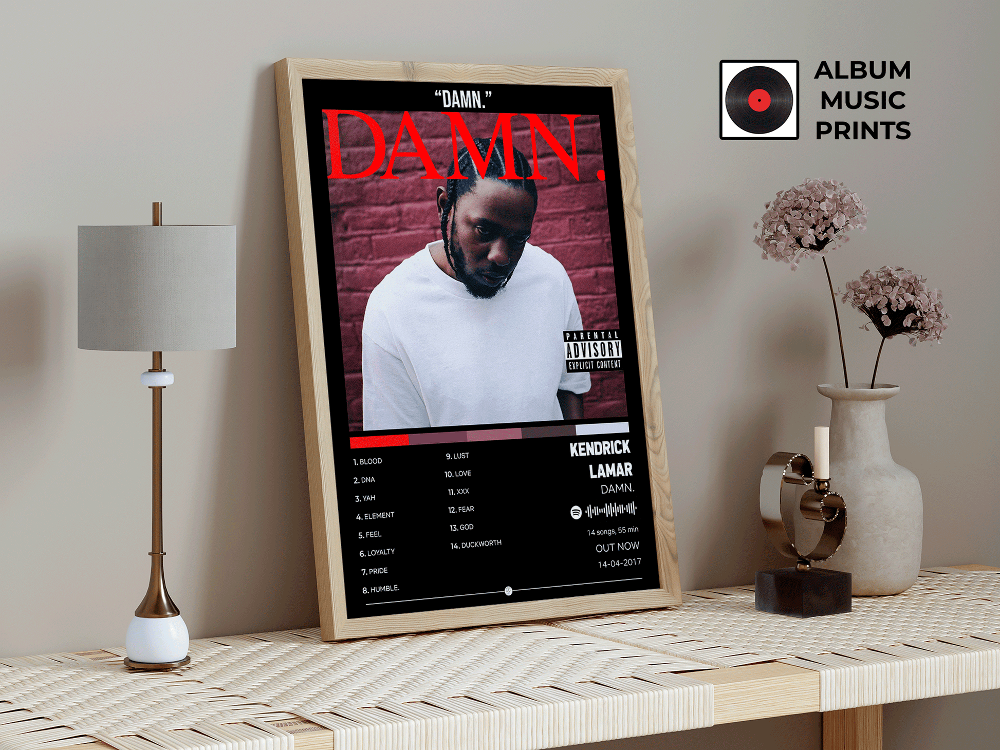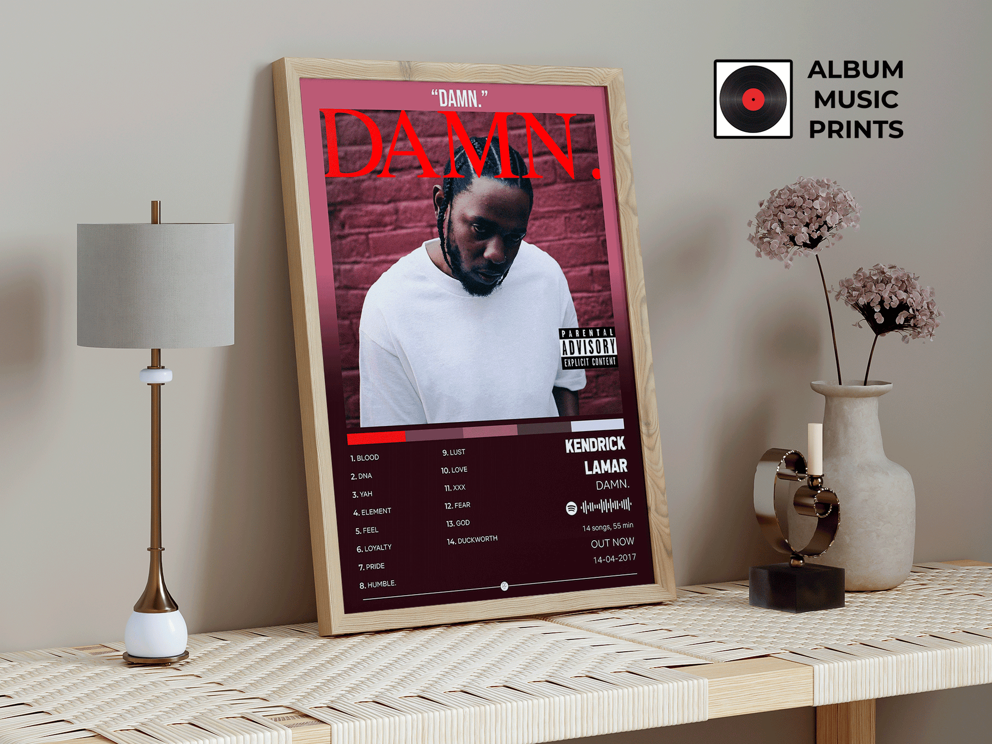 Descarga el póster digital del icónico álbum DAMN de Kendrick Lamar, ganador del Premio Pulitzer y uno de los discos más influyentes del hip-hop contemporáneo. Este diseño captura la esencia cruda y poderosa de un álbum que redefinió el rap moderno con tracks como HUMBLE, DNA y LOYALTY.