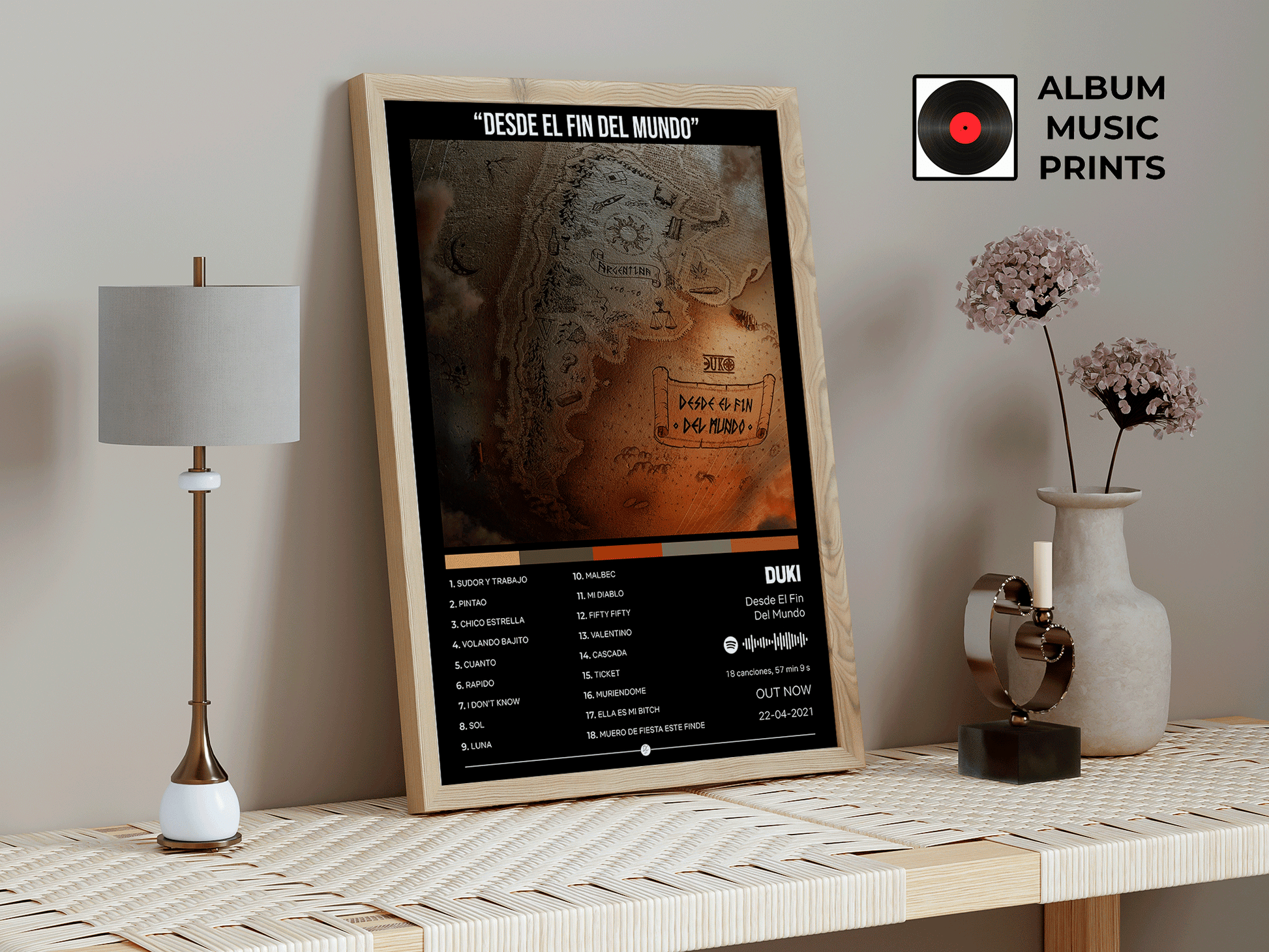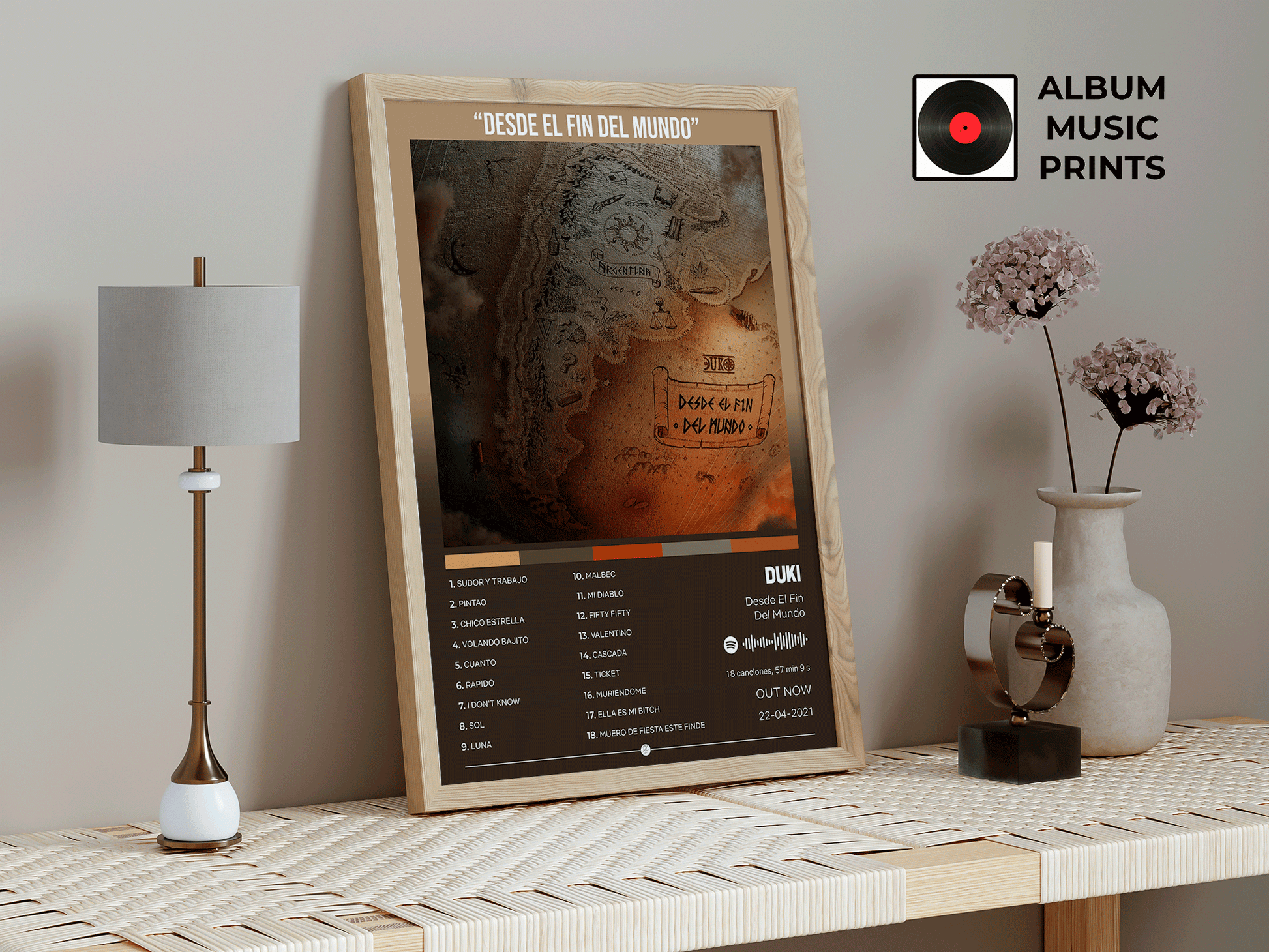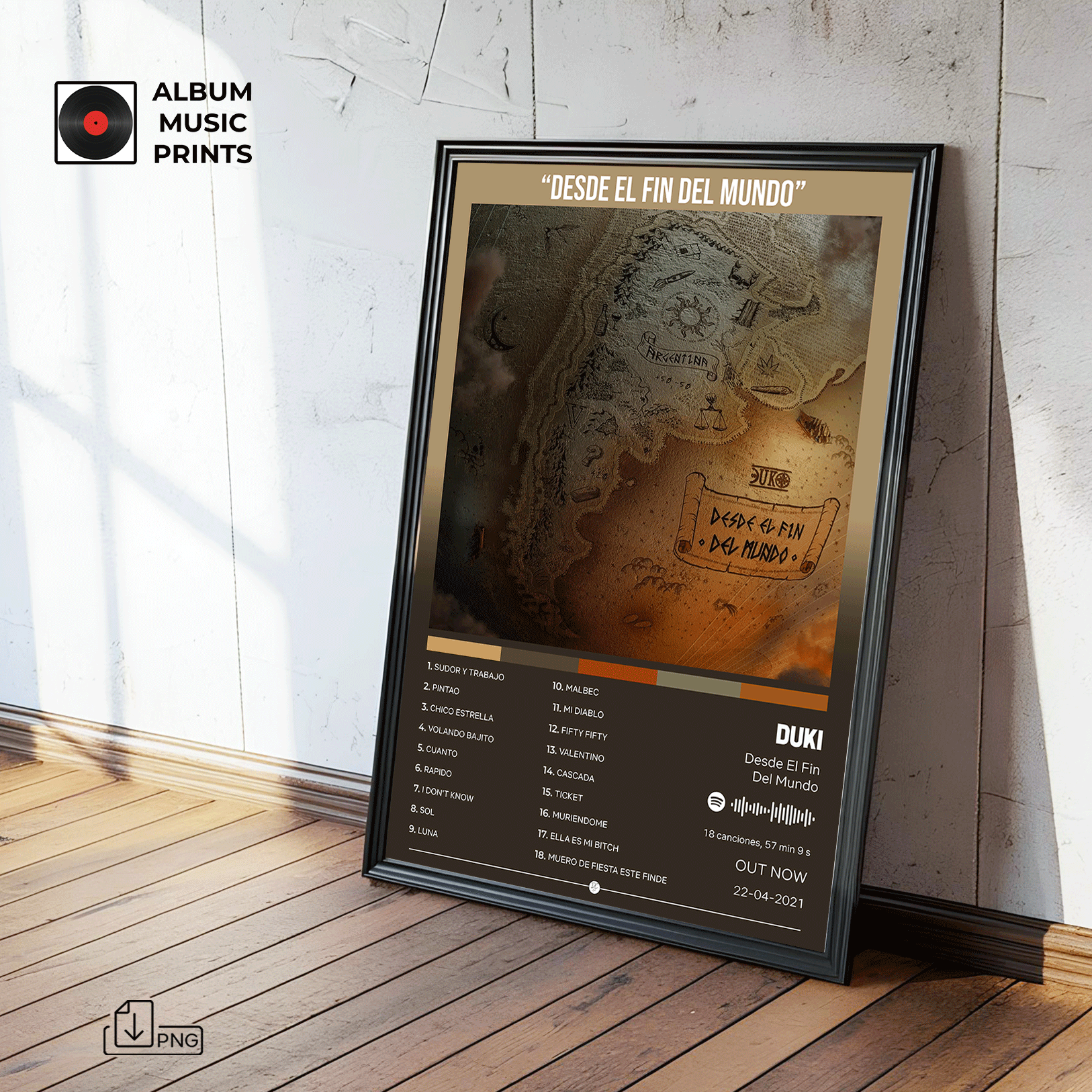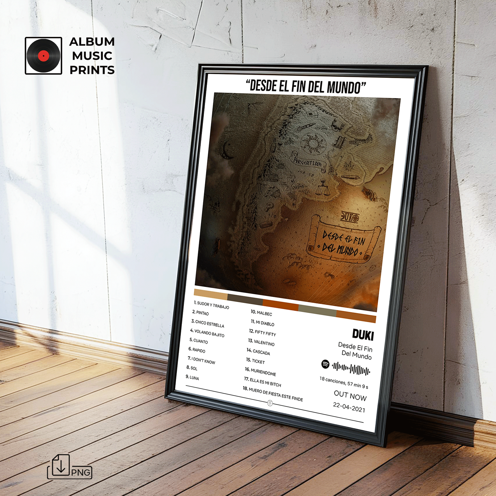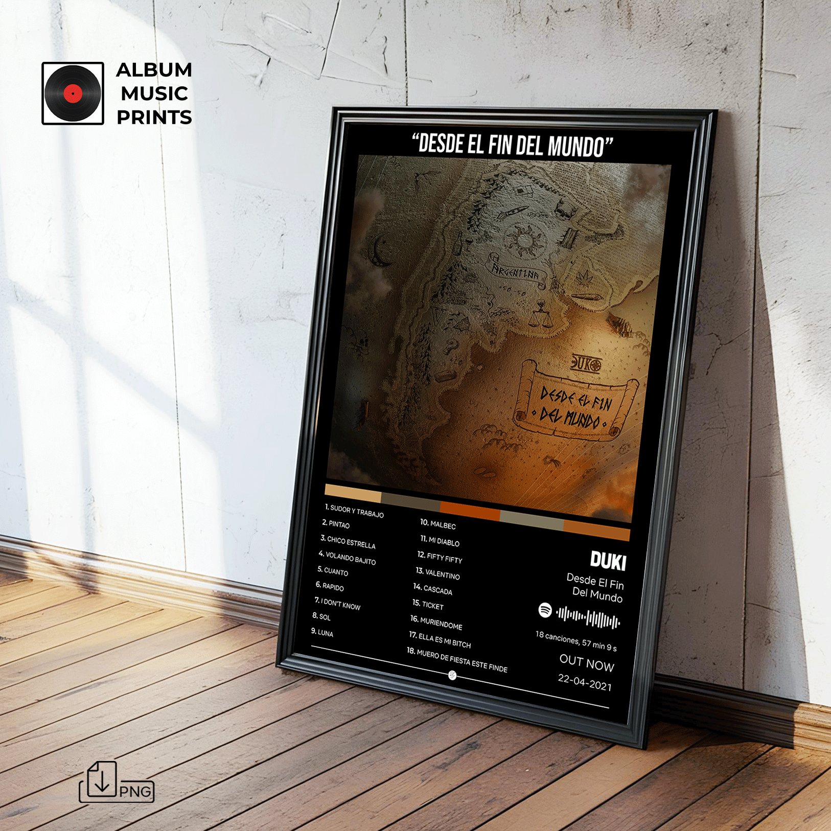 Descarga instantánea de póster digital de alta calidad del álbum Desde El Fin Del Mundo de DUKI. Perfecto para decorar tu espacio con el arte de uno de los álbumes más icónicos del trap argentino.
