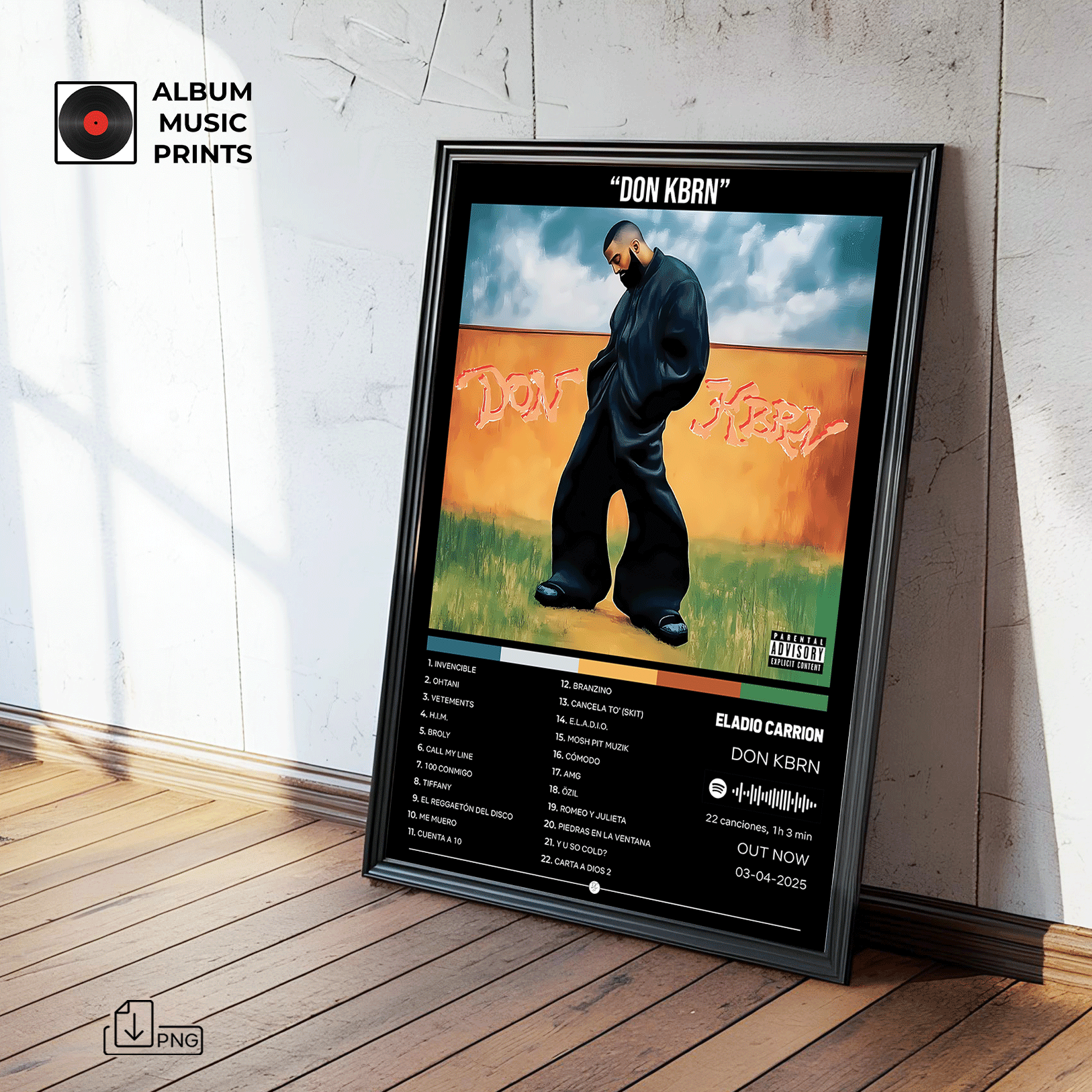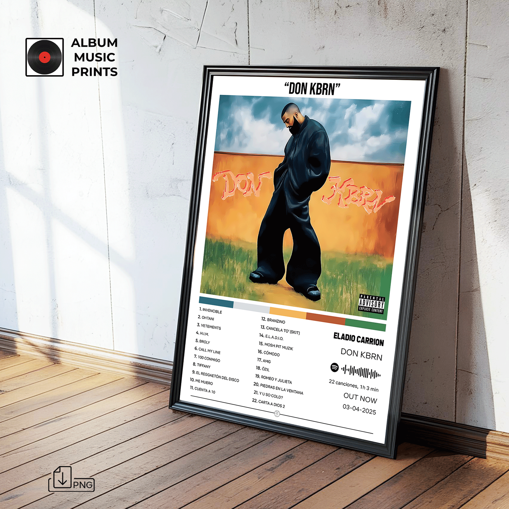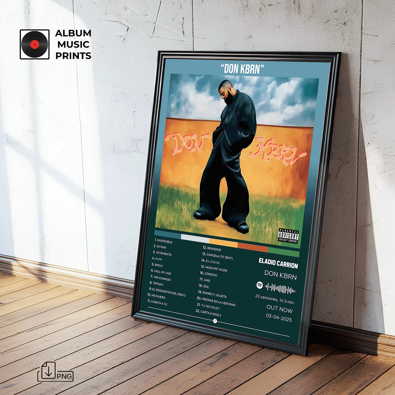 Descarga instantánea de arte digital de alta calidad del álbum DON KBRN de Eladio Carrión. Perfecto para fans, coleccionistas y decoradores que buscan capturar la esencia del trap latino y el estilo único de uno de los máximos exponentes de la música urbana contemporánea.