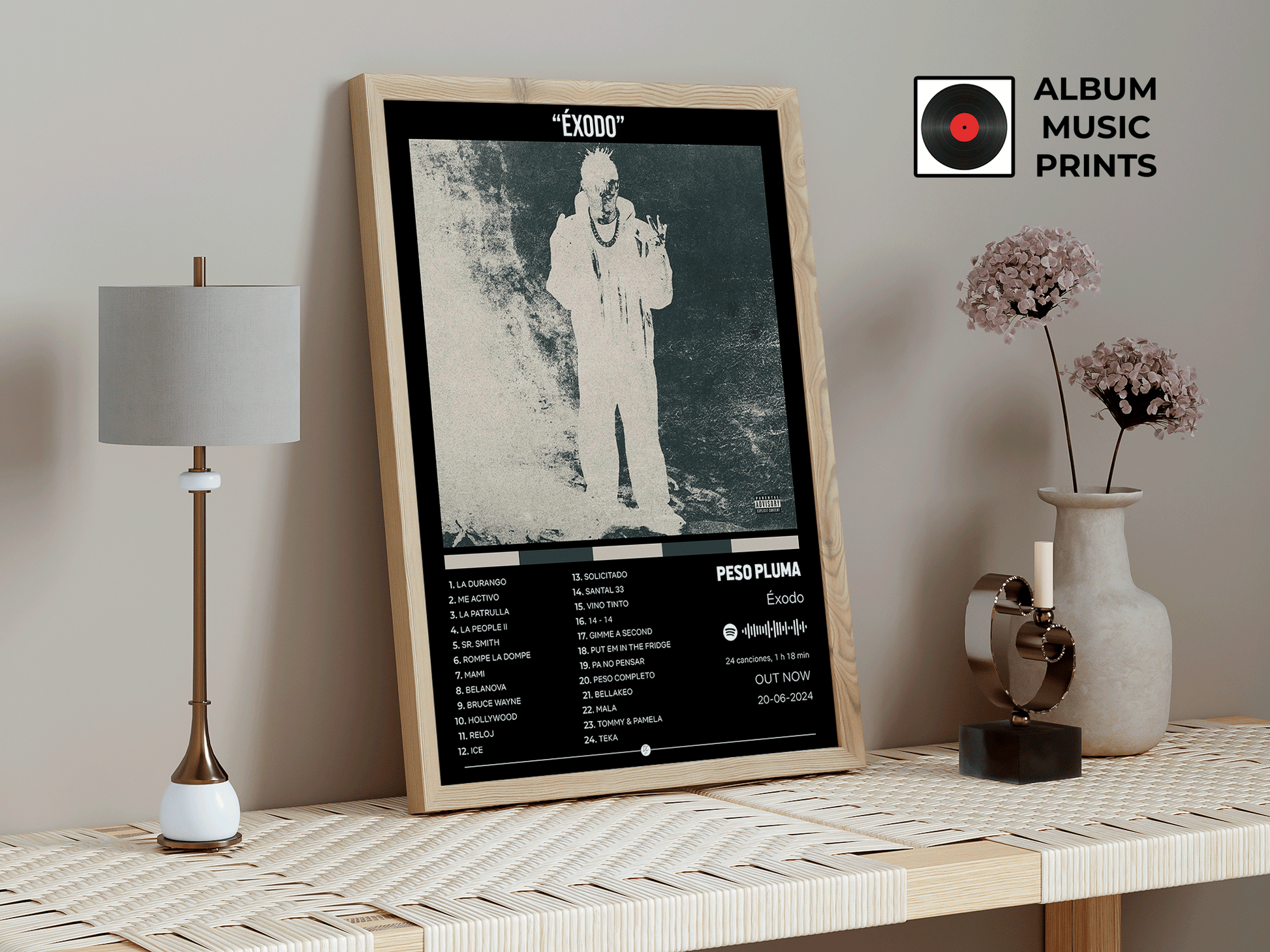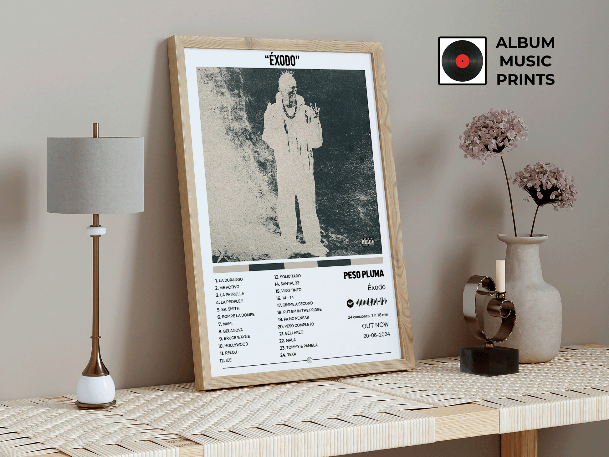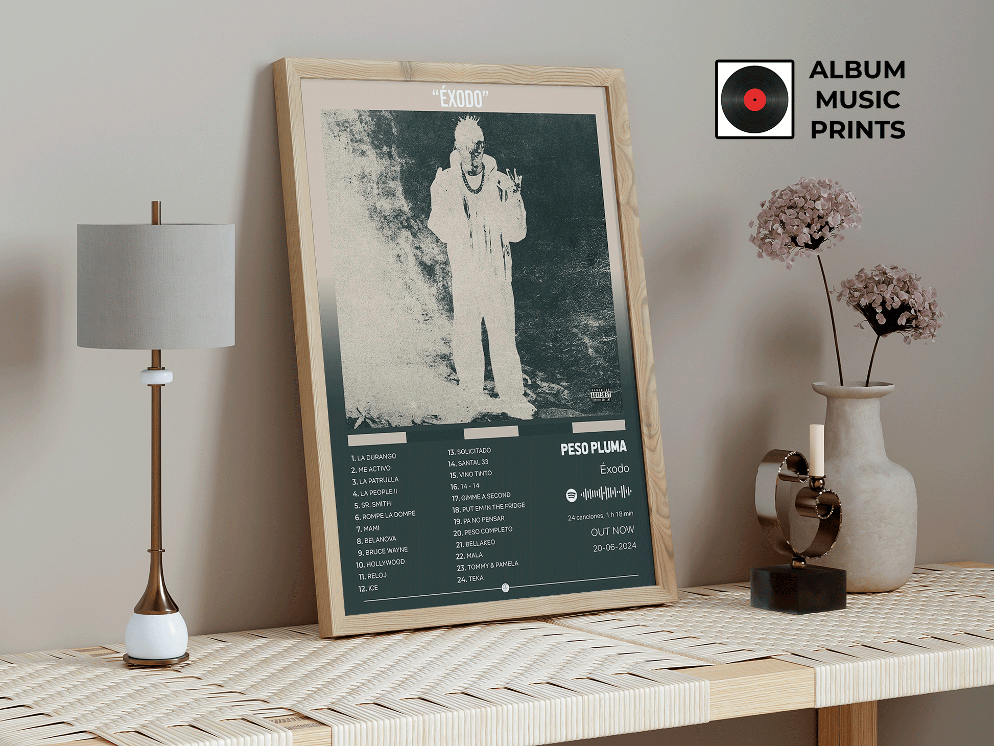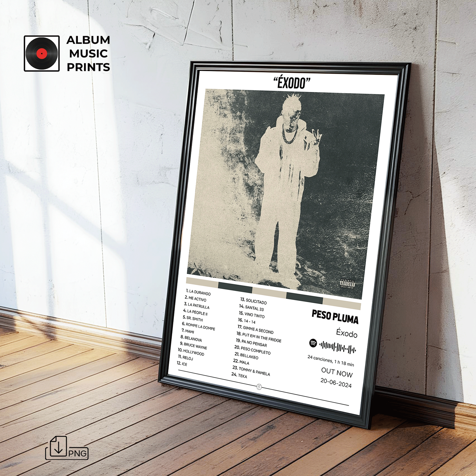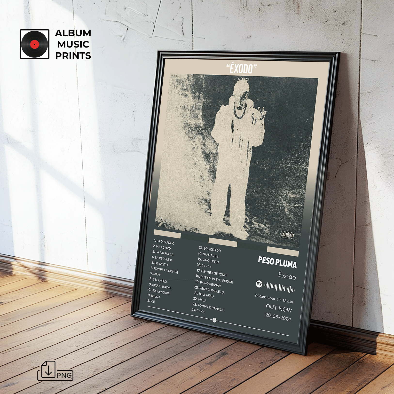Descarga instantánea de póster digital de alta calidad del álbum ÉXODO de PESO PLUMA. Perfecto para decorar tu espacio con el arte de uno de los álbumes más icónicos de los corridos tumbados y la música regional mexicana.