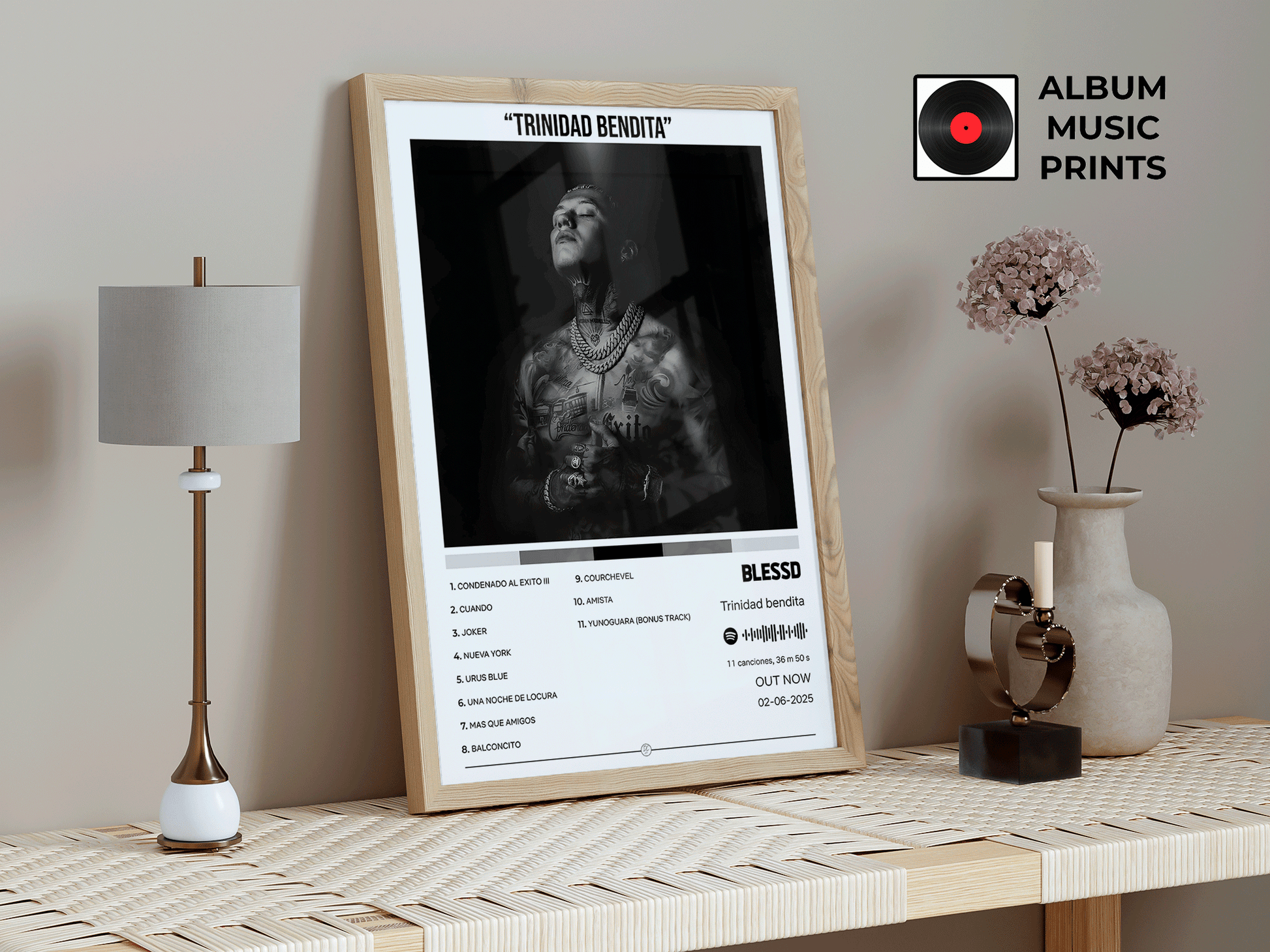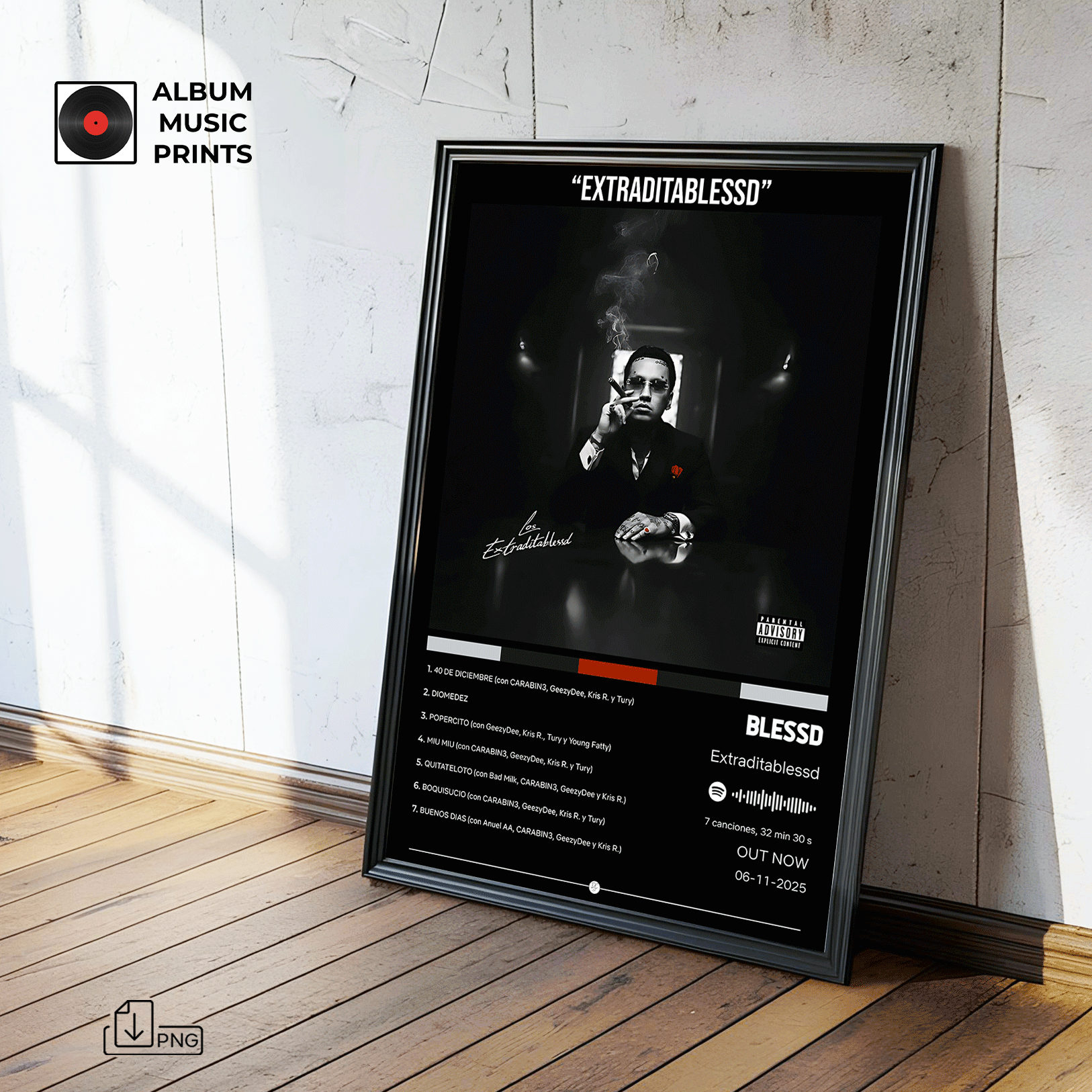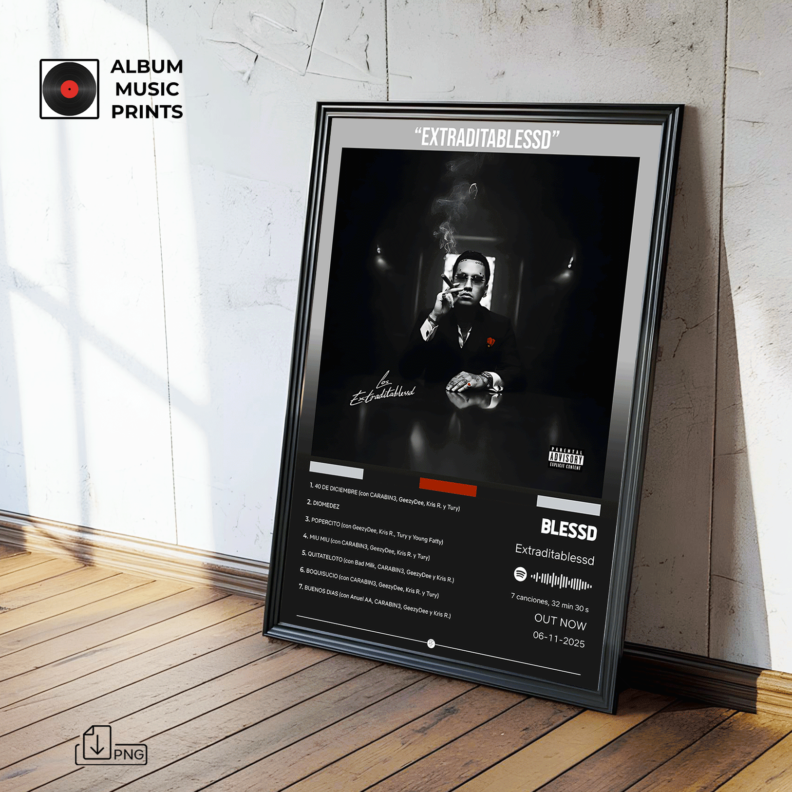 Transforma tu espacio con este exclusivo poster digital del álbum EXTRADITABLESSD de Blessd. Perfecto para fanáticos del reggaetón urbano y coleccionistas de arte musical contemporáneo.