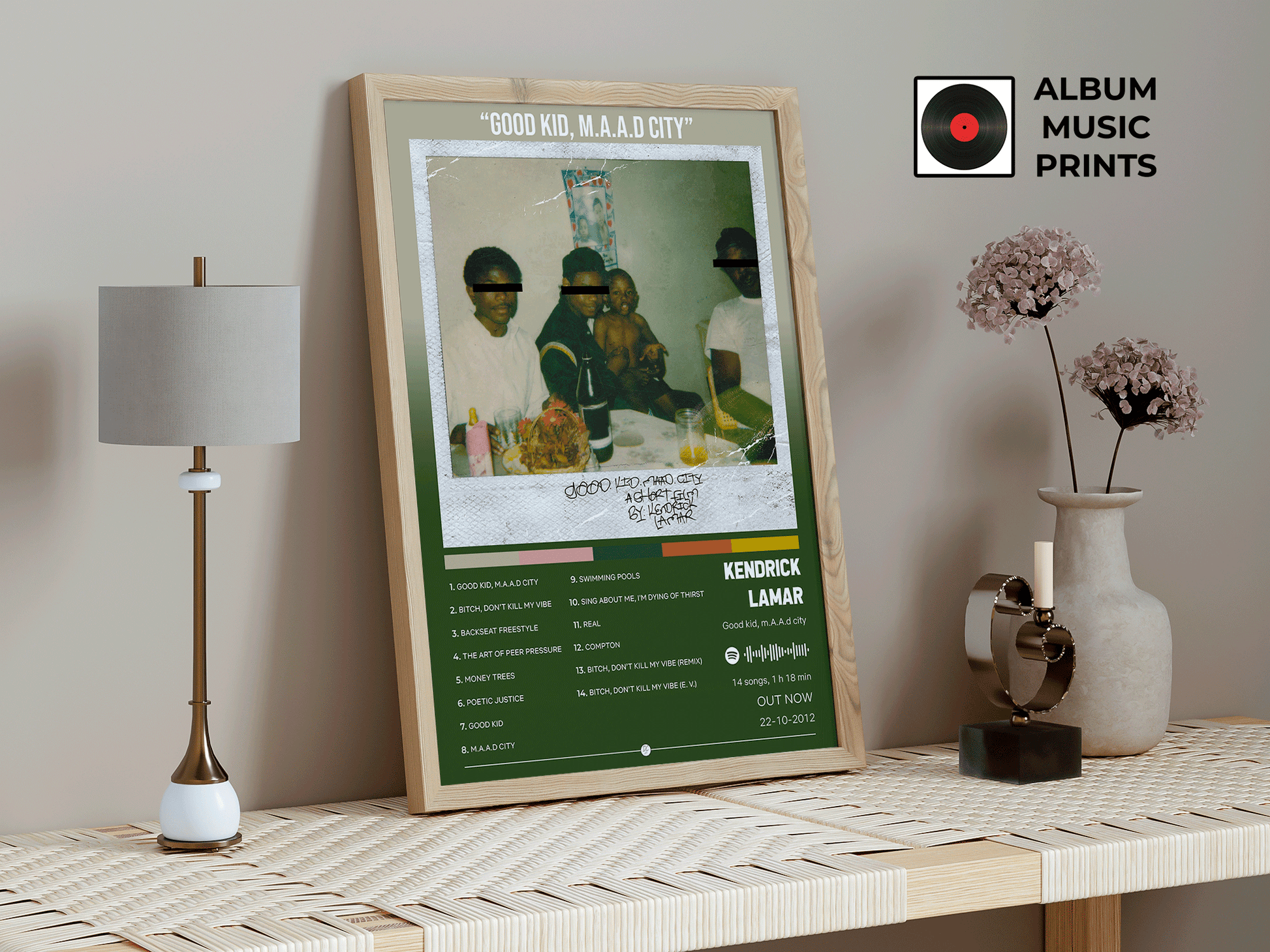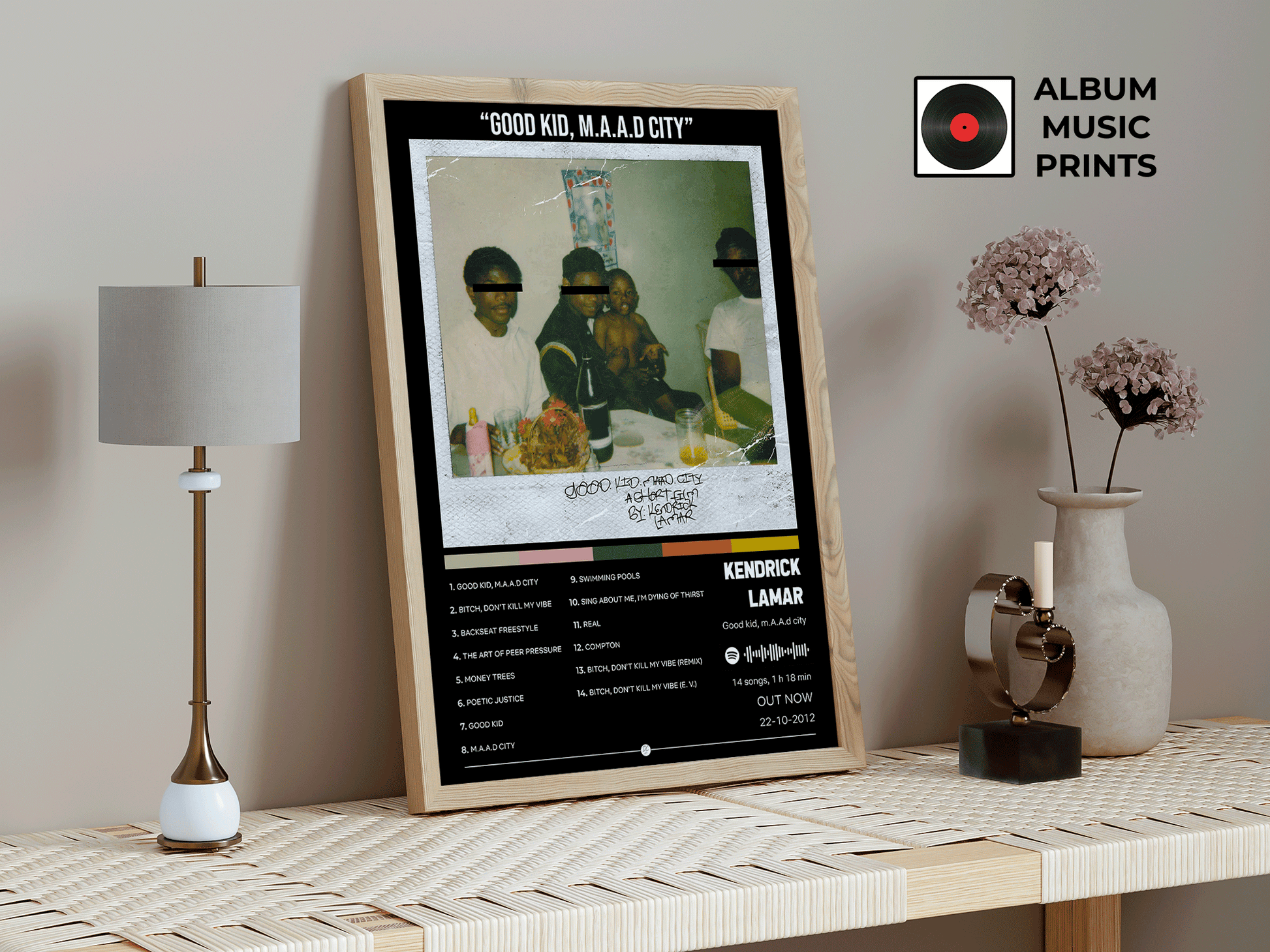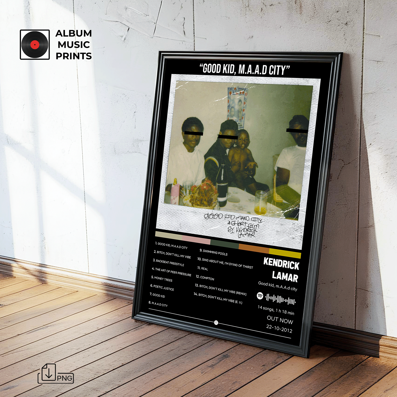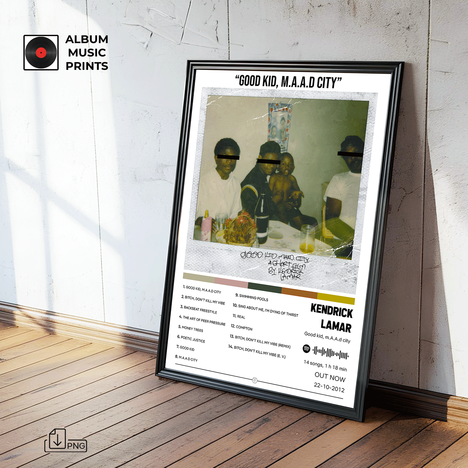 Descarga el póster digital del legendario álbum good kid, m.A.A.d city de Kendrick Lamar, una obra maestra cinematográfica del hip-hop que narra la historia de un joven en Compton. Este disco conceptual revolucionó el rap con tracks inolvidables como Swimming Pools, Poetic Justice, m.A.A.d city y Bitch, Don't Kill My Vibe.