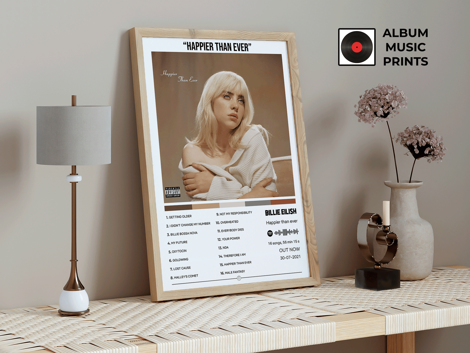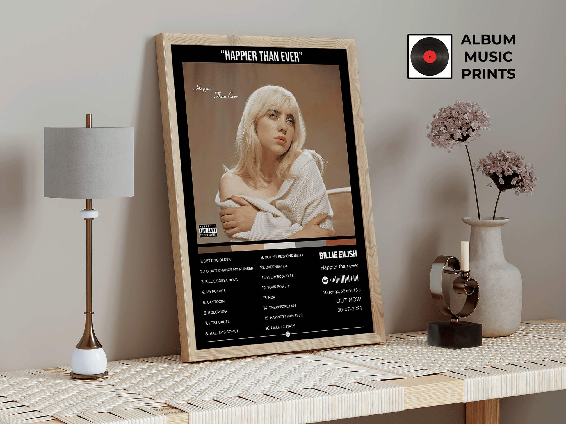 Arte oficial del álbum que revolucionó la música pop. Diseño minimalista y elegante que captura la evolución artística de Billie Eilish. Ideal para enmarcar y decorar tu espacio con estilo contemporáneo.