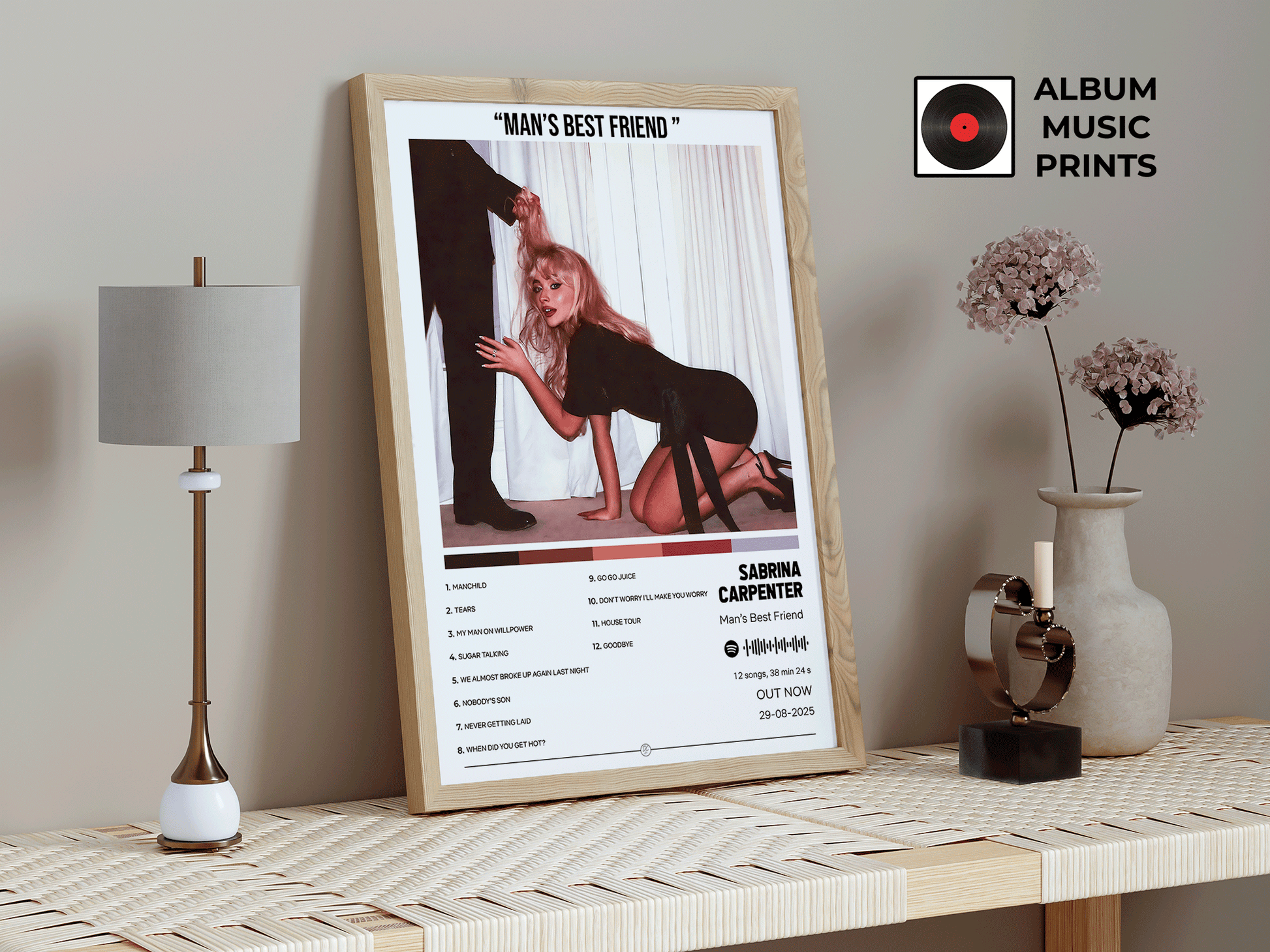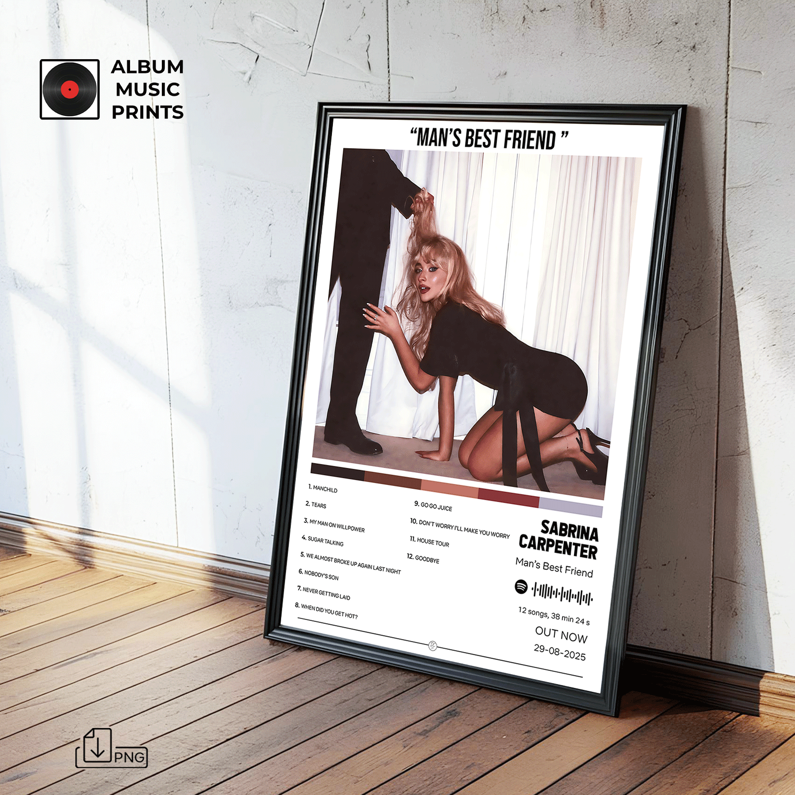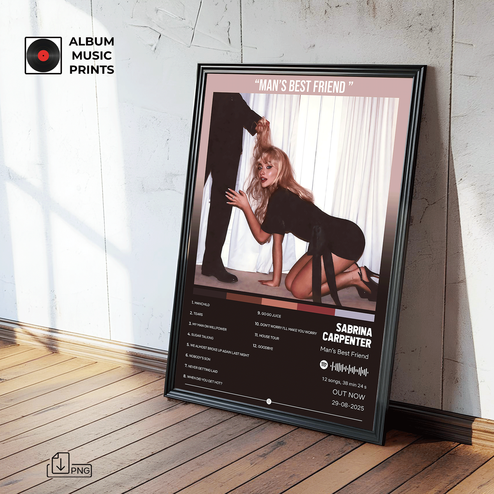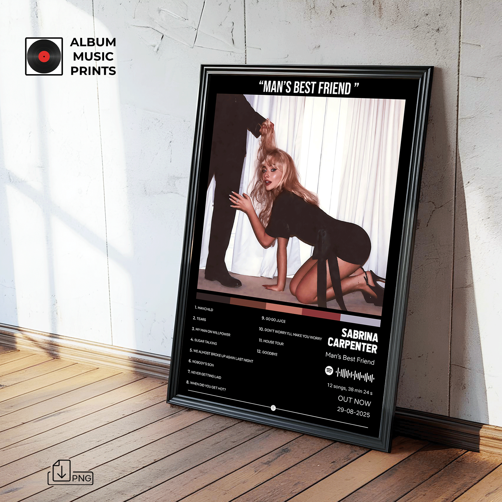 Descarga instantánea del póster digital del álbum Man's Best Friend de Sabrina Carpenter. Arte musical premium de alta calidad, perfecto para decorar tu espacio con el estilo único de esta icónica artista pop.