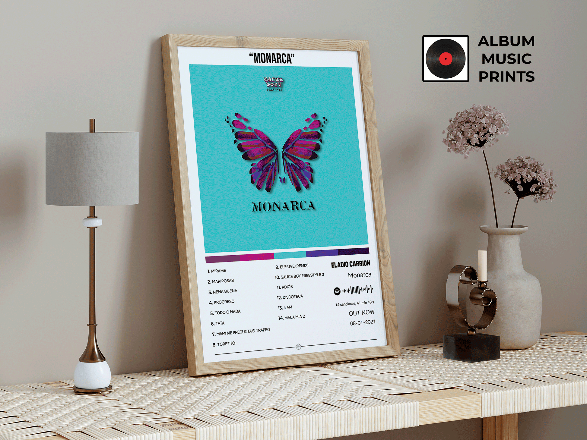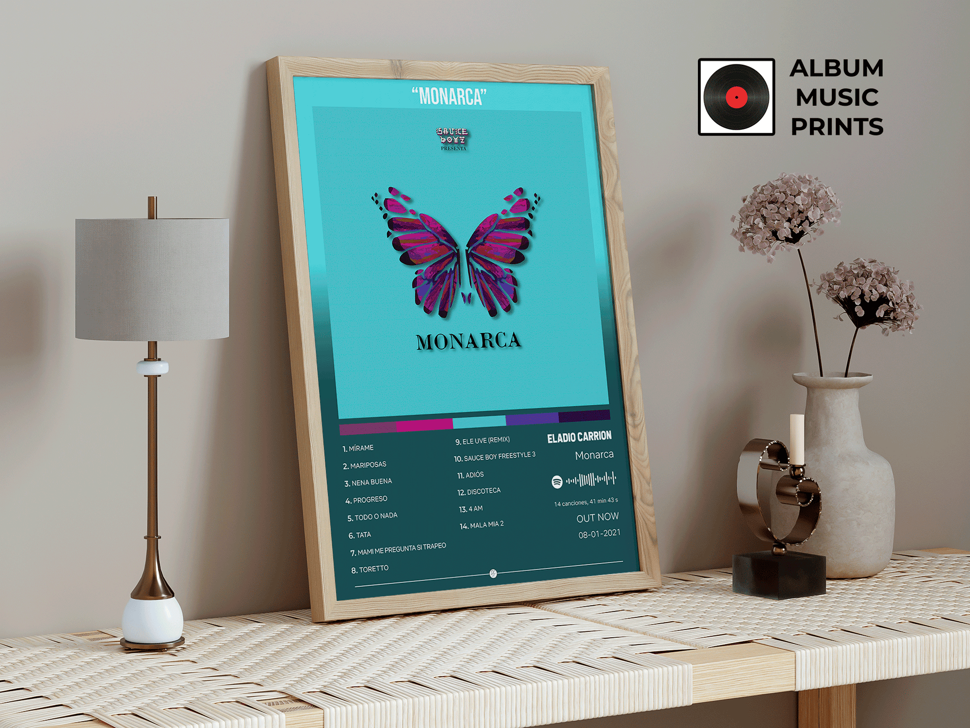 Arte oficial del álbum que consolidó a Eladio Carrión como el monarca del trap latino. Diseño urbano y poderoso que representa el flow inconfundible, las letras profundas y la actitud única del artista. Ideal para enmarcar y decorar tu espacio con la energía del mejor trap en español.