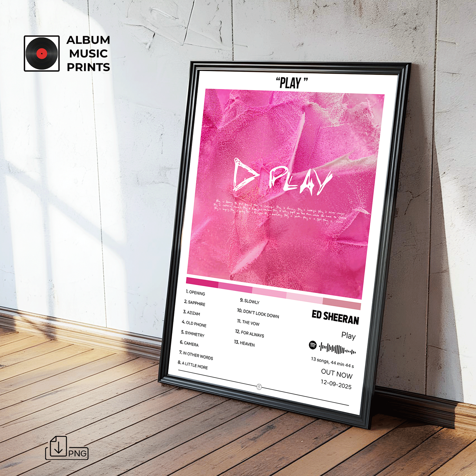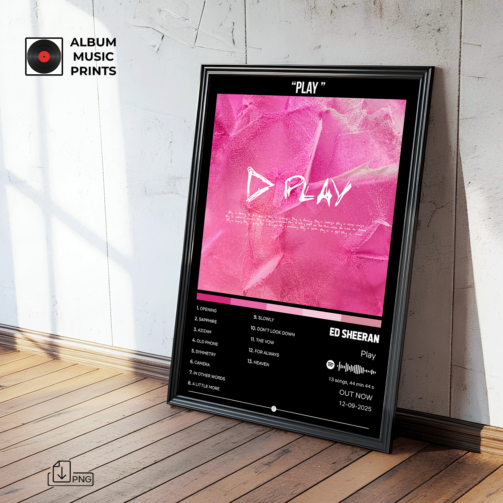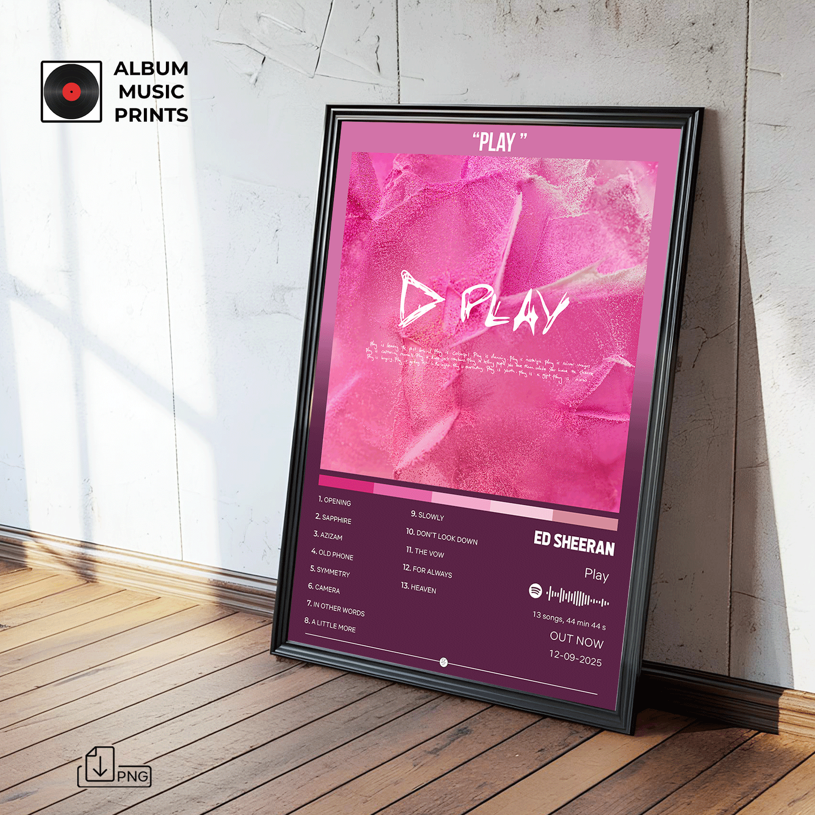 Descarga tu póster digital del álbum PLAY de Ed Sheeran y transforma tu espacio con arte musical de calidad premium.