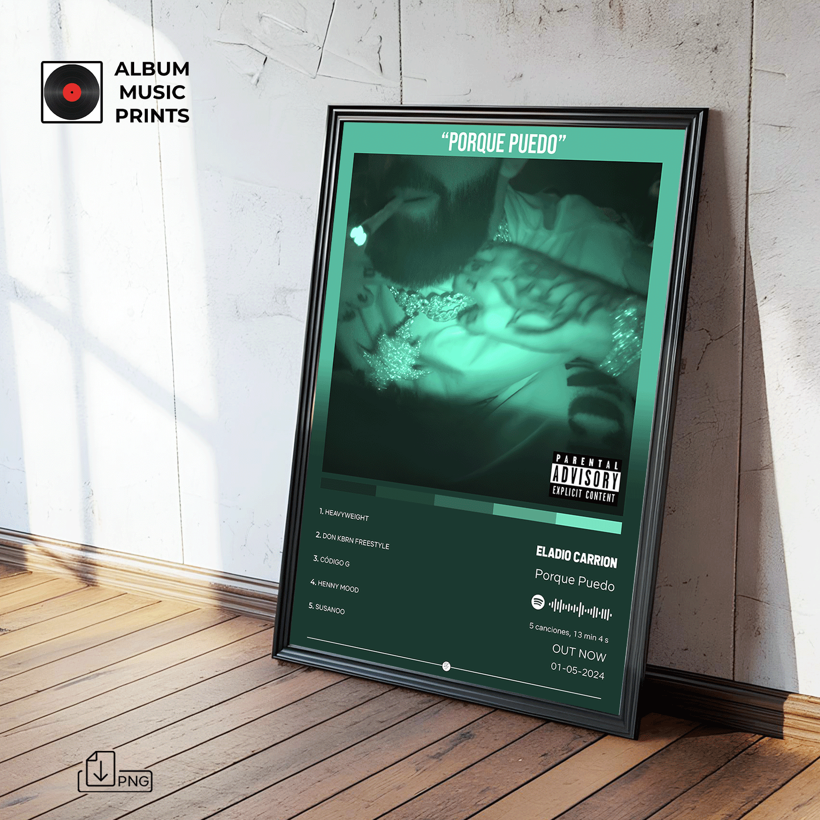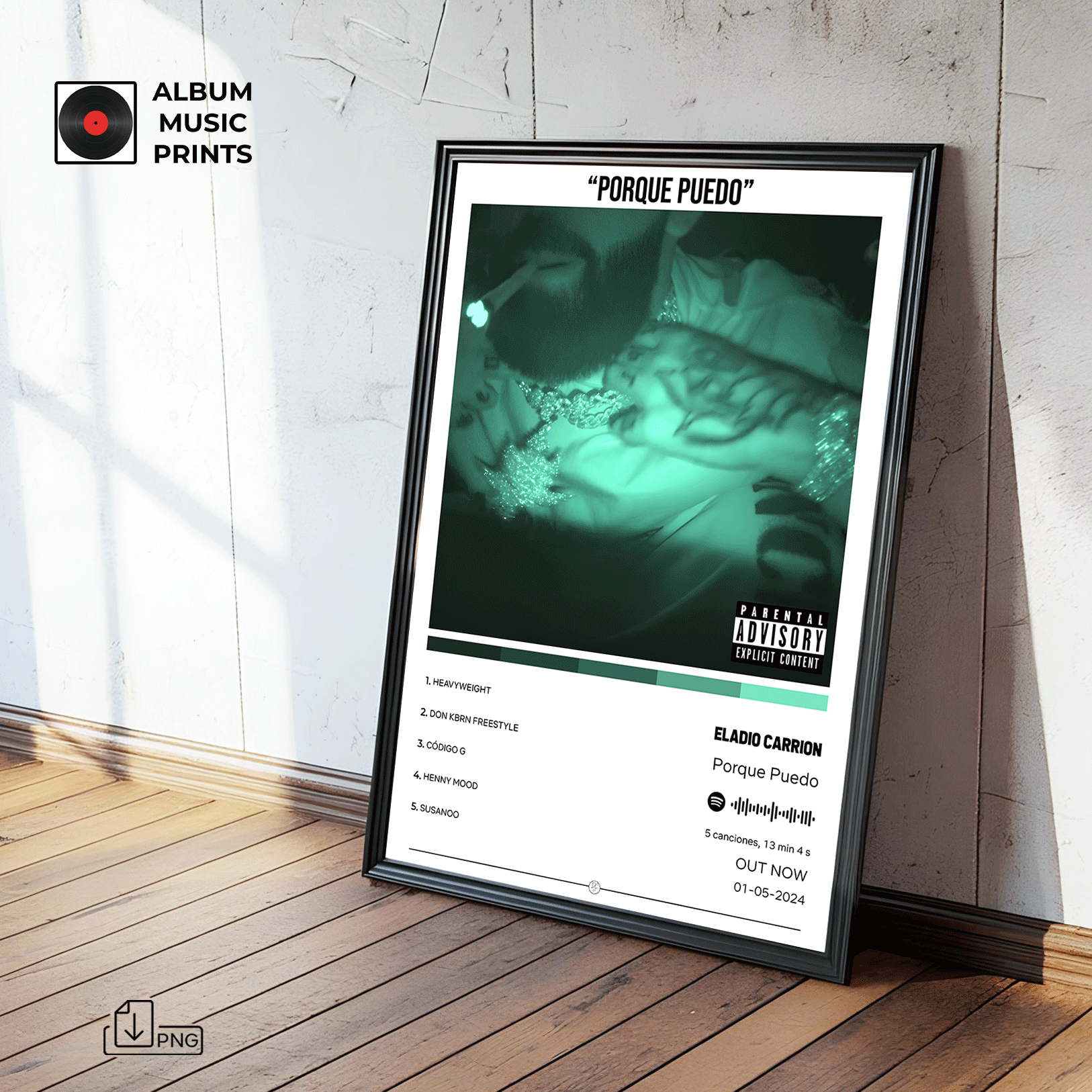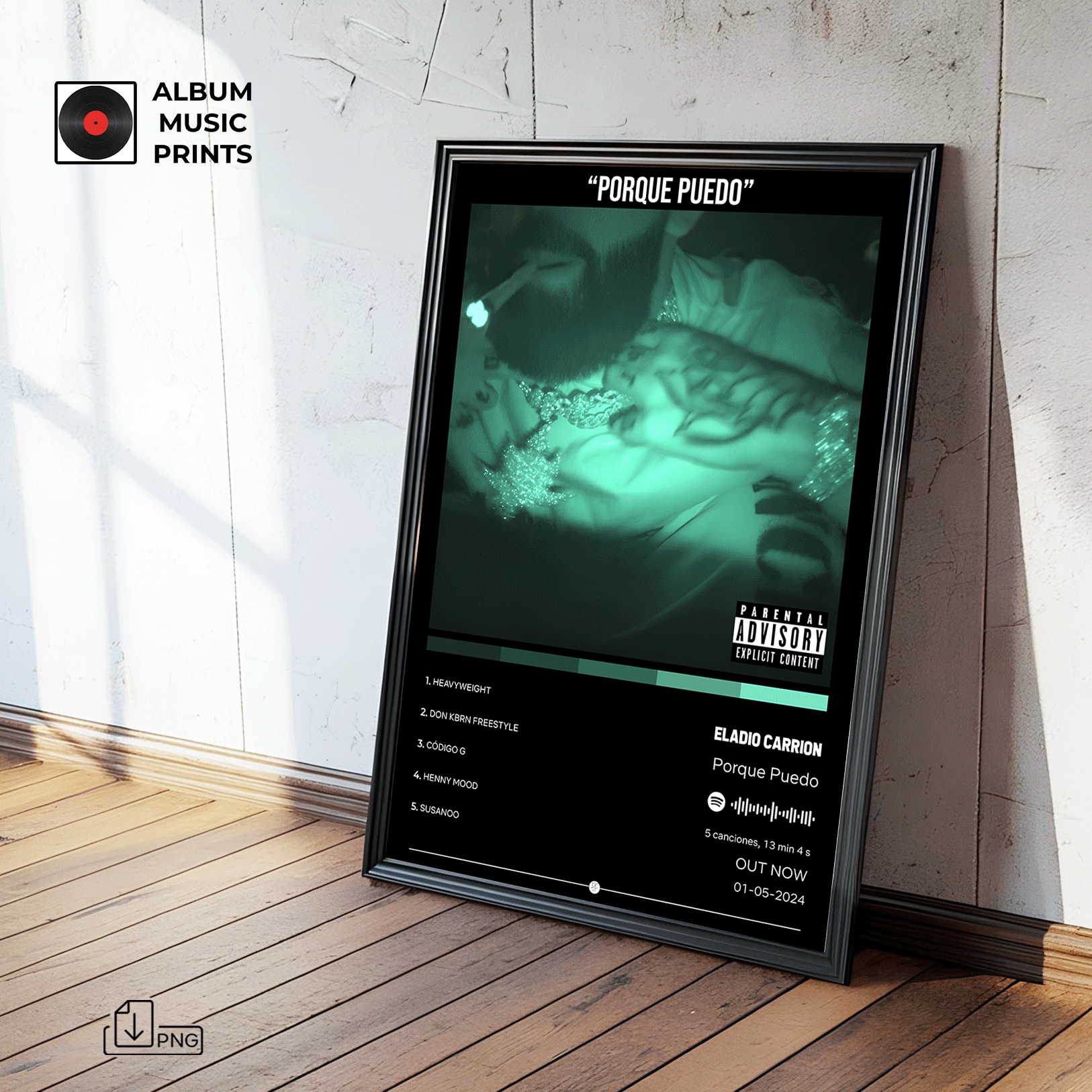 Descarga instantánea de arte digital de alta calidad del álbum PORQUE PUEDO de Eladio Carrión. Perfecto para fans, coleccionistas y decoradores que buscan capturar la actitud única y el estilo inconfundible de uno de los artistas más influyentes del trap latino contemporáneo.