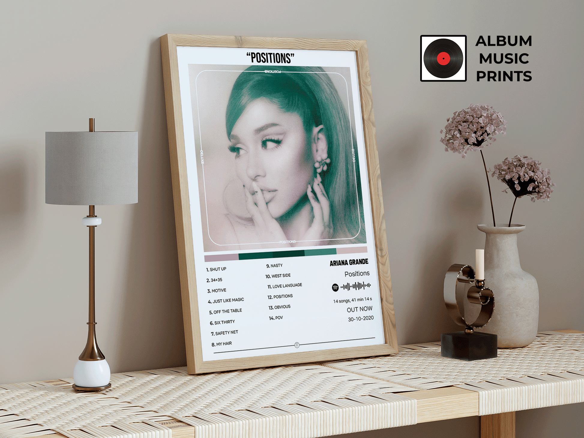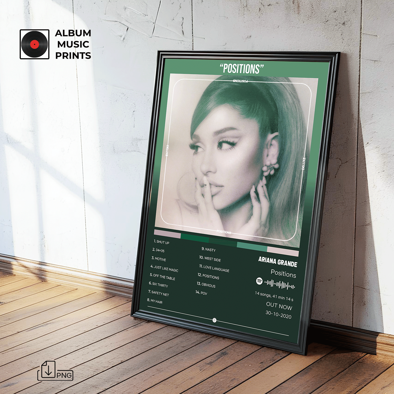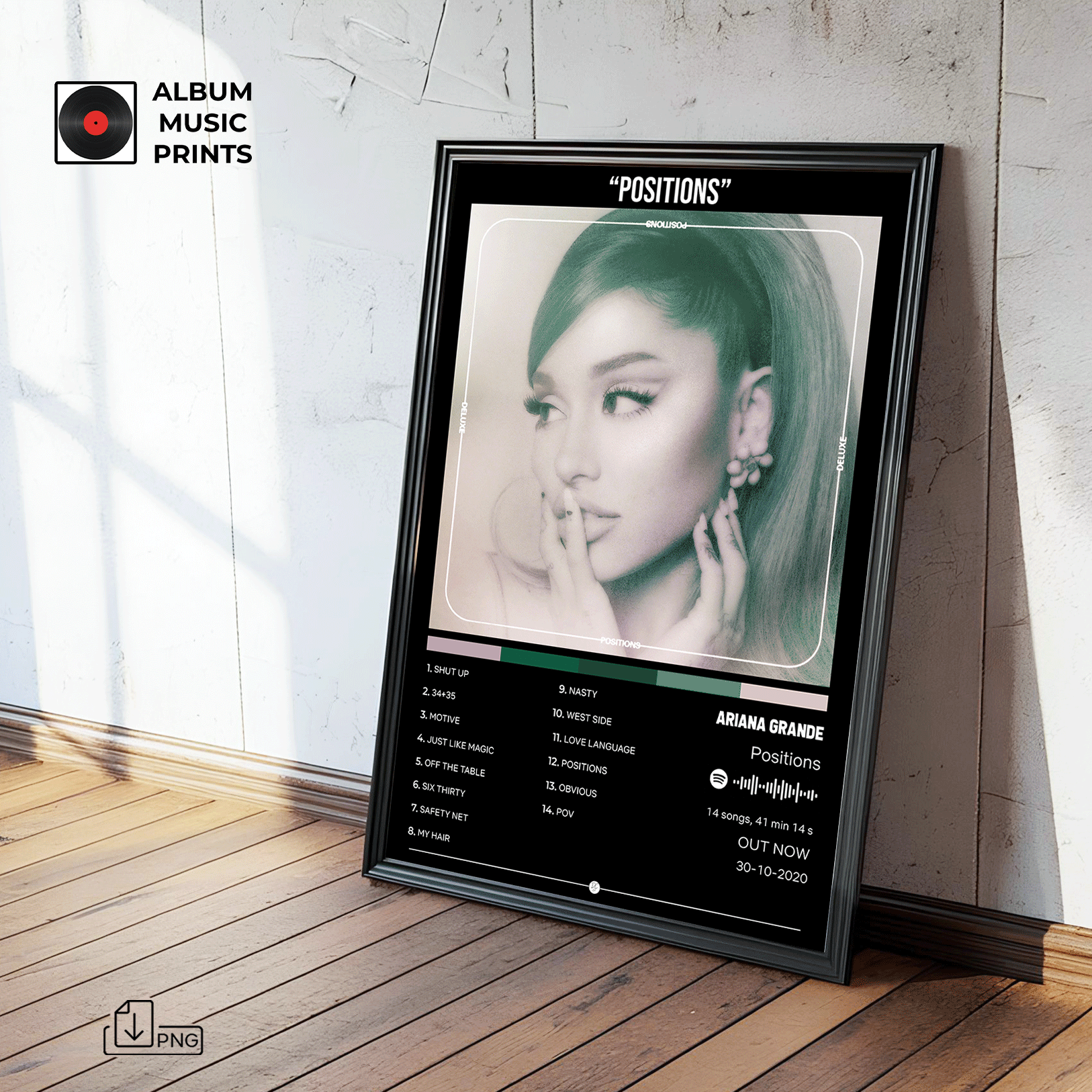 Descarga instantánea del póster digital del álbum Positions de Ariana Grande. Diseño exclusivo de alta calidad, perfecto para decorar tu espacio con el arte visual de uno de los álbumes más icónicos de la música pop contemporánea.