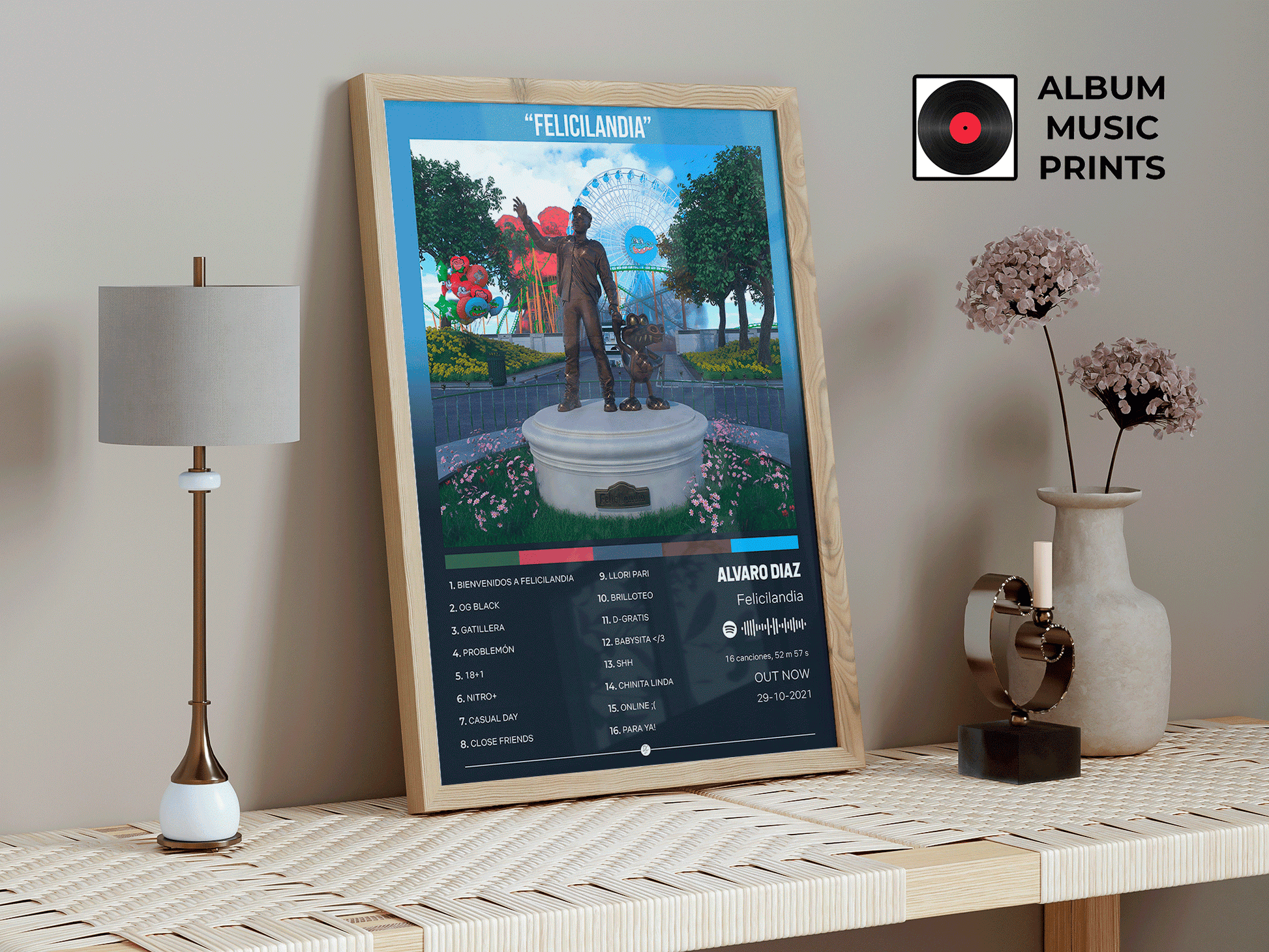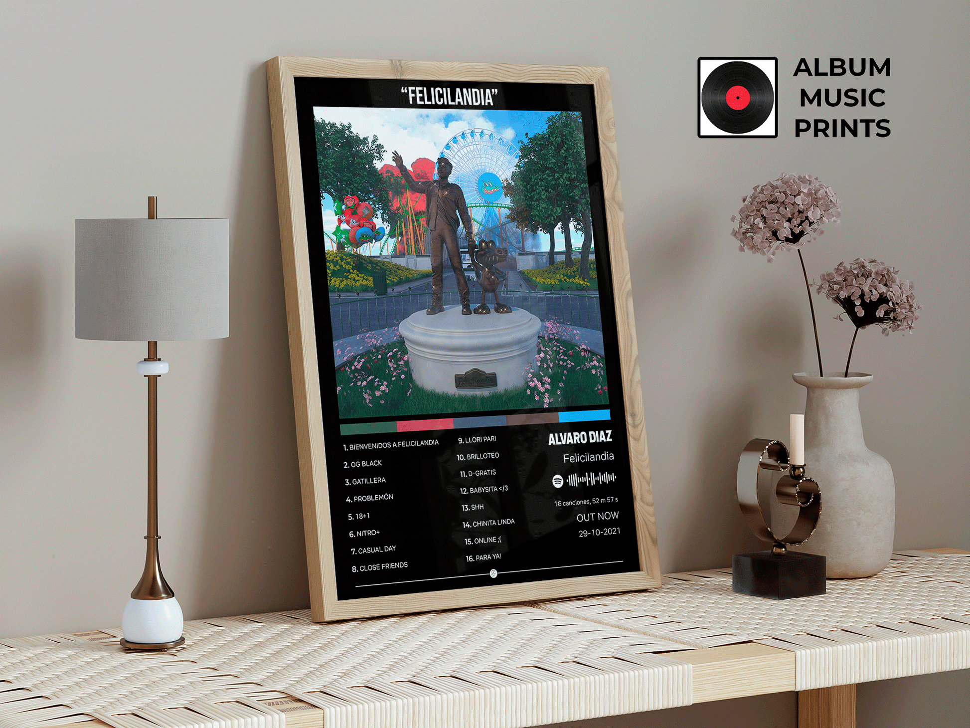 Transforma tu espacio con el arte visual del icónico álbum FELICILANDIA de Alvaro Diaz. Este poster digital de alta calidad captura la esencia urbana y contemporánea de uno de los álbumes más celebrados del trap latino.