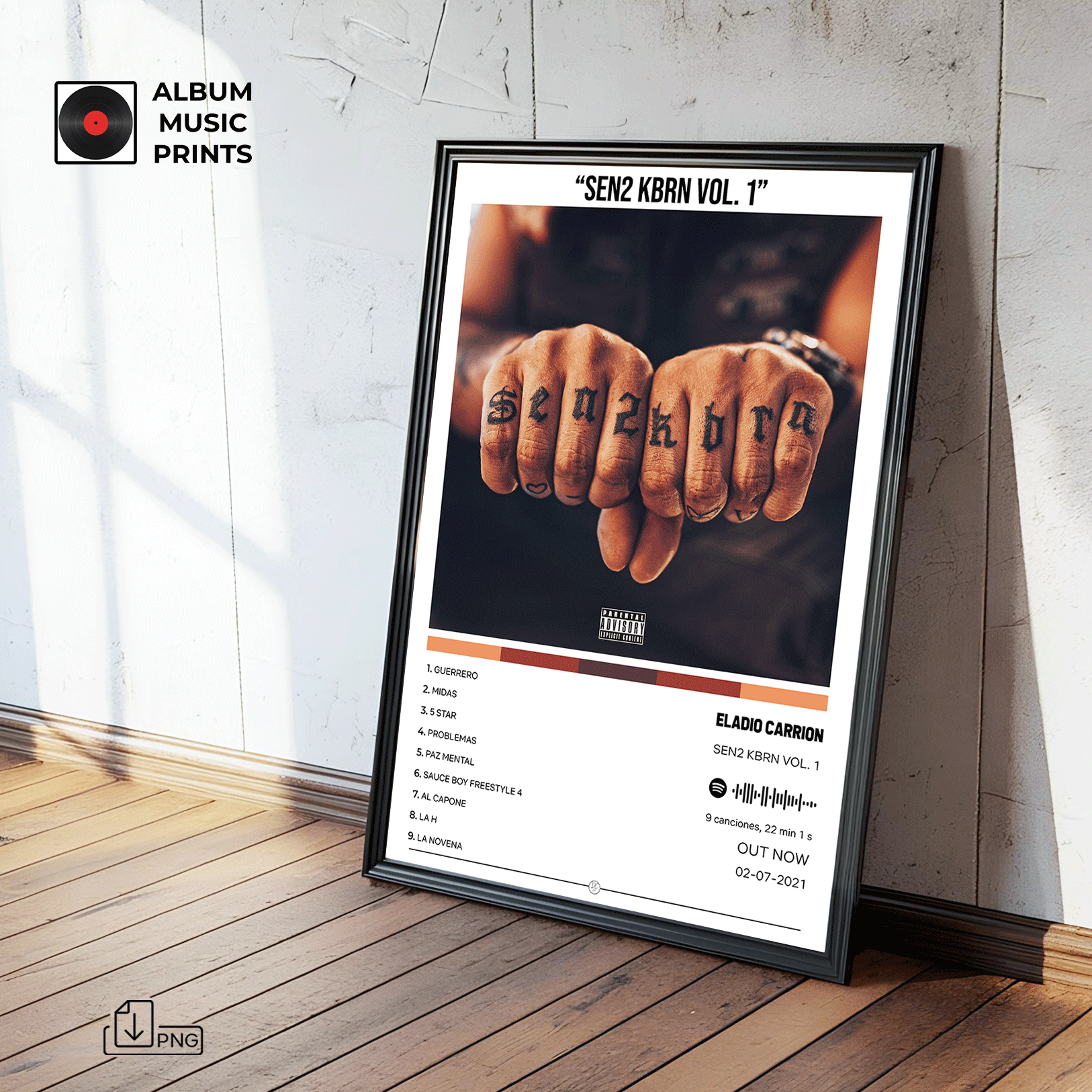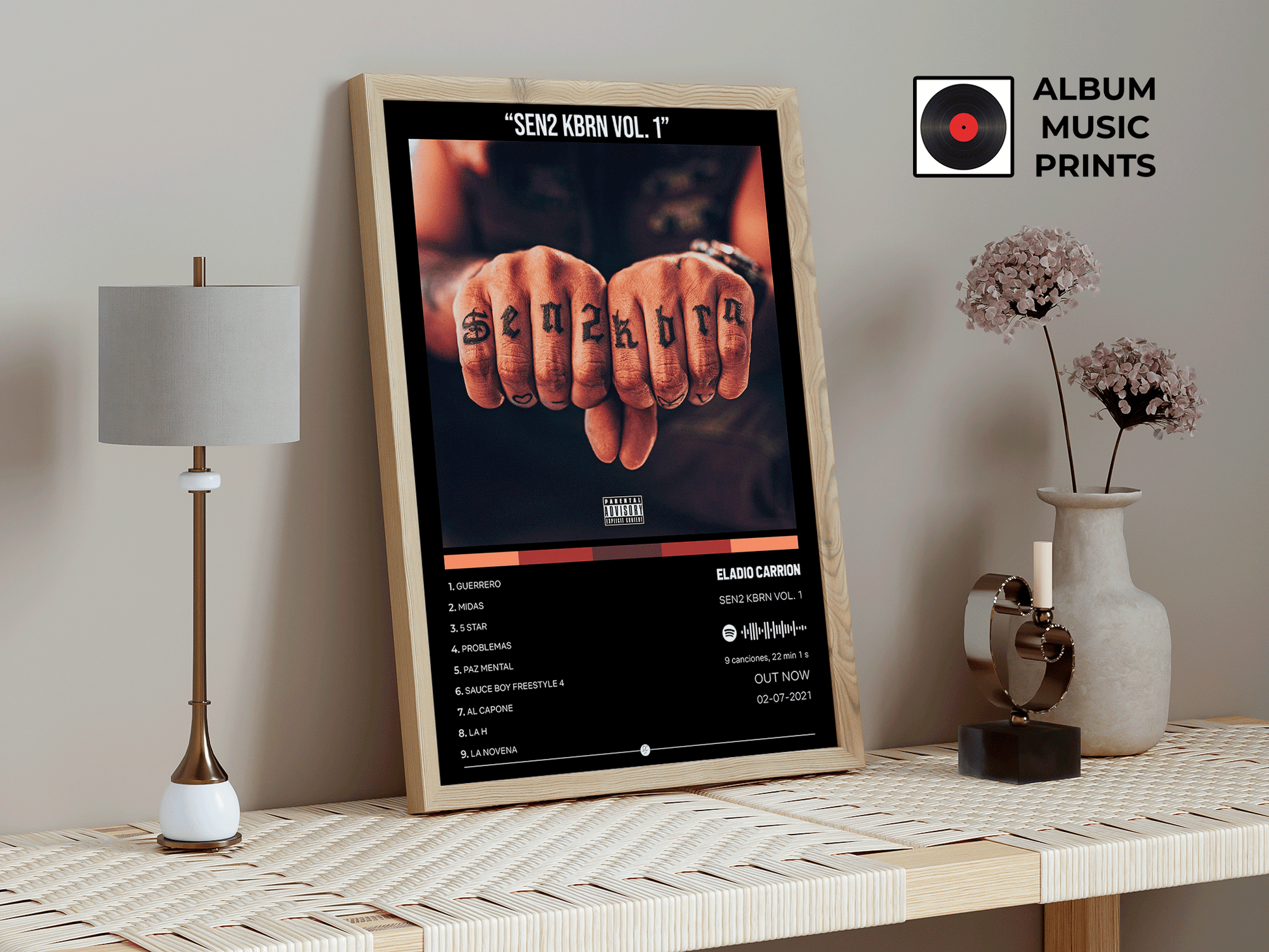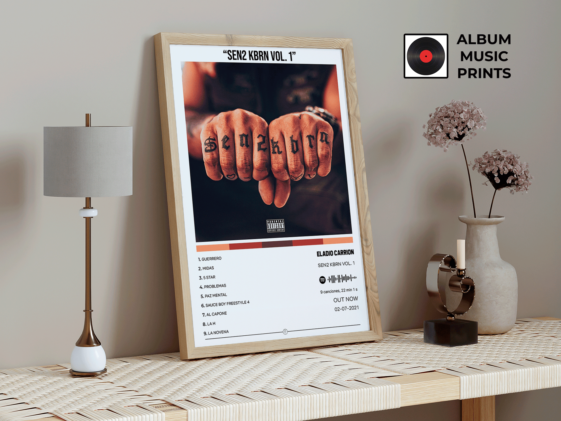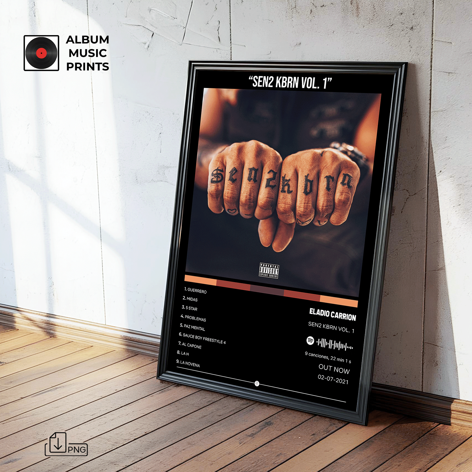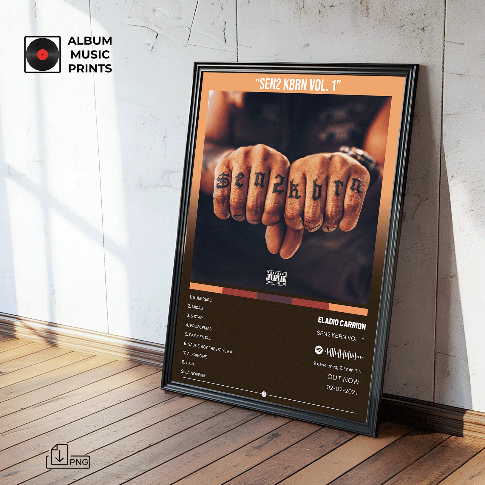 Transforma tu espacio con este impactante póster digital inspirado en el álbum SEN2 KBRN VOL. 1 de Eladio Carrión. Diseño urbano y audaz que captura la esencia del trap latino y el estilo único de uno de los artistas más influyentes de la nueva generación del género urbano.