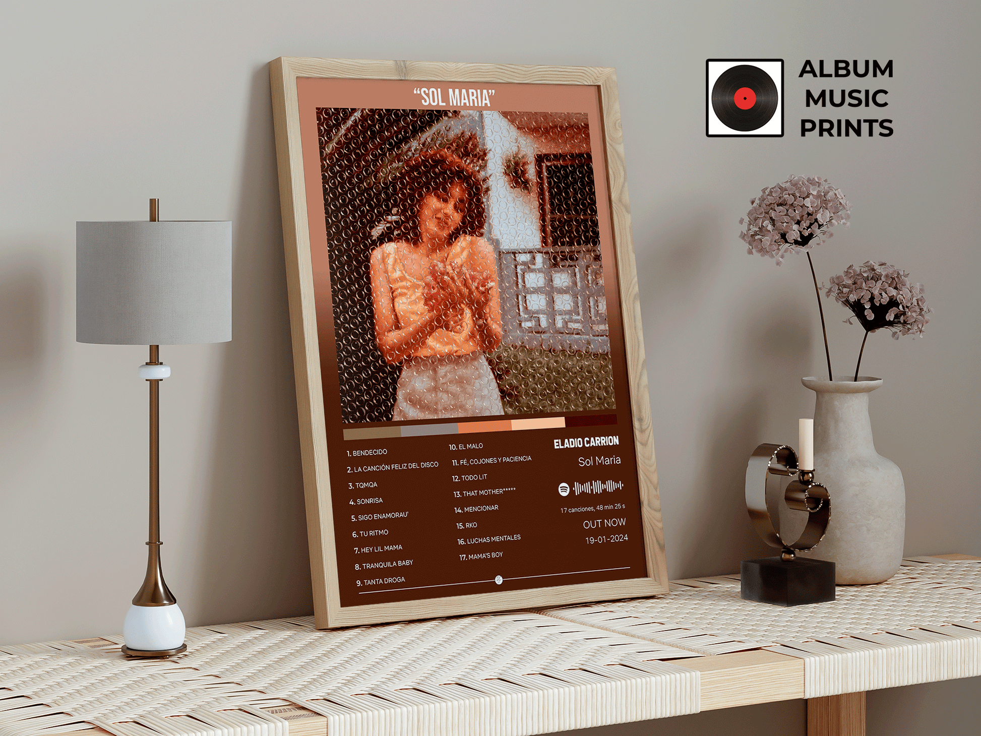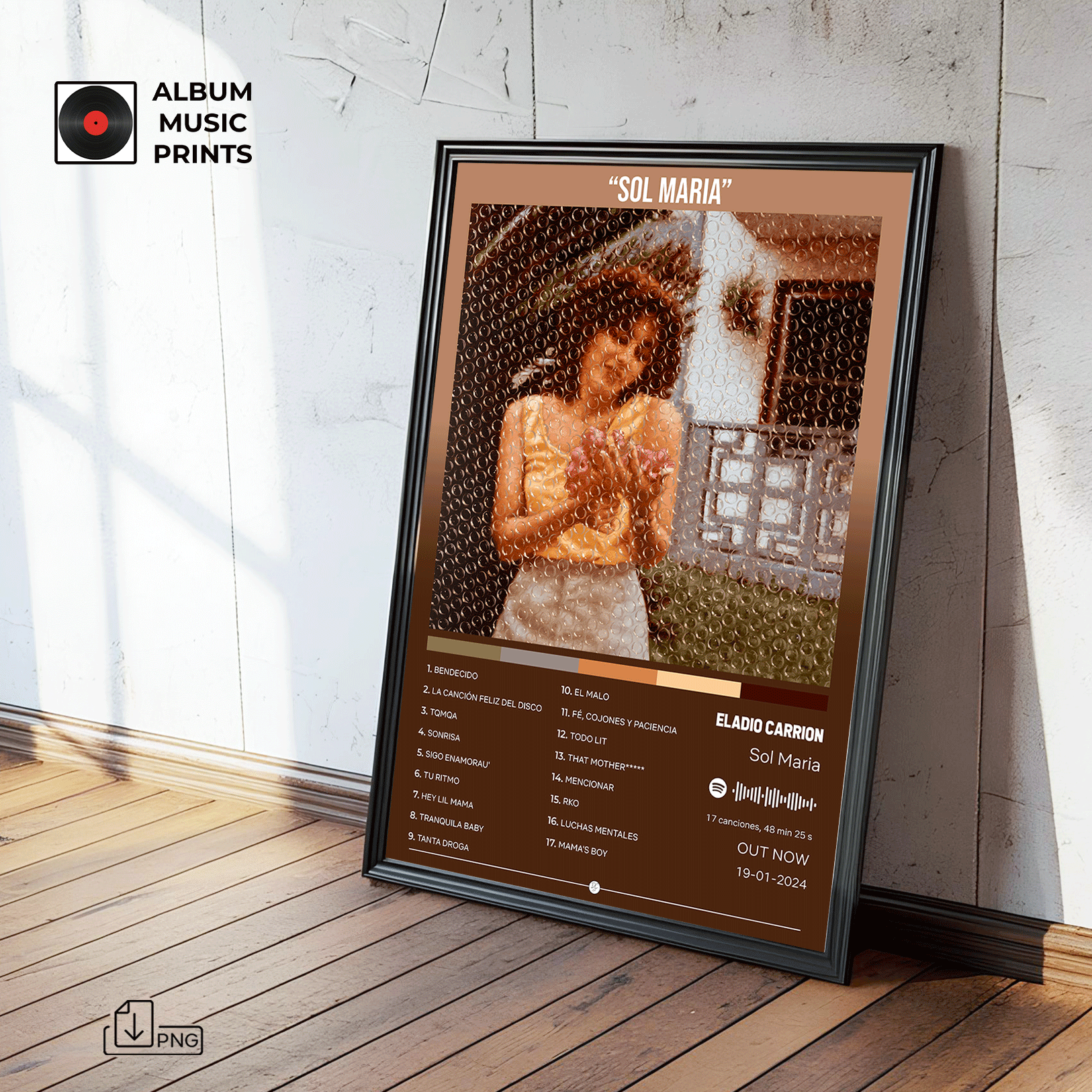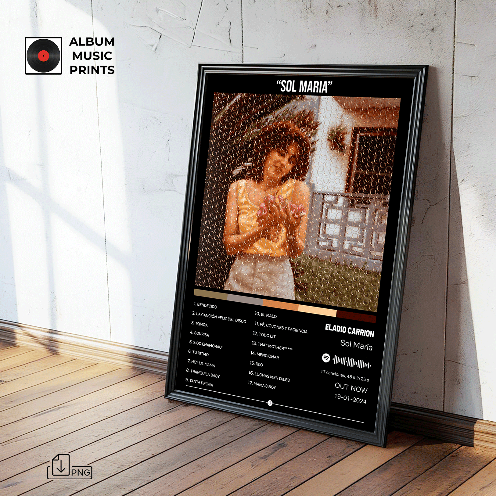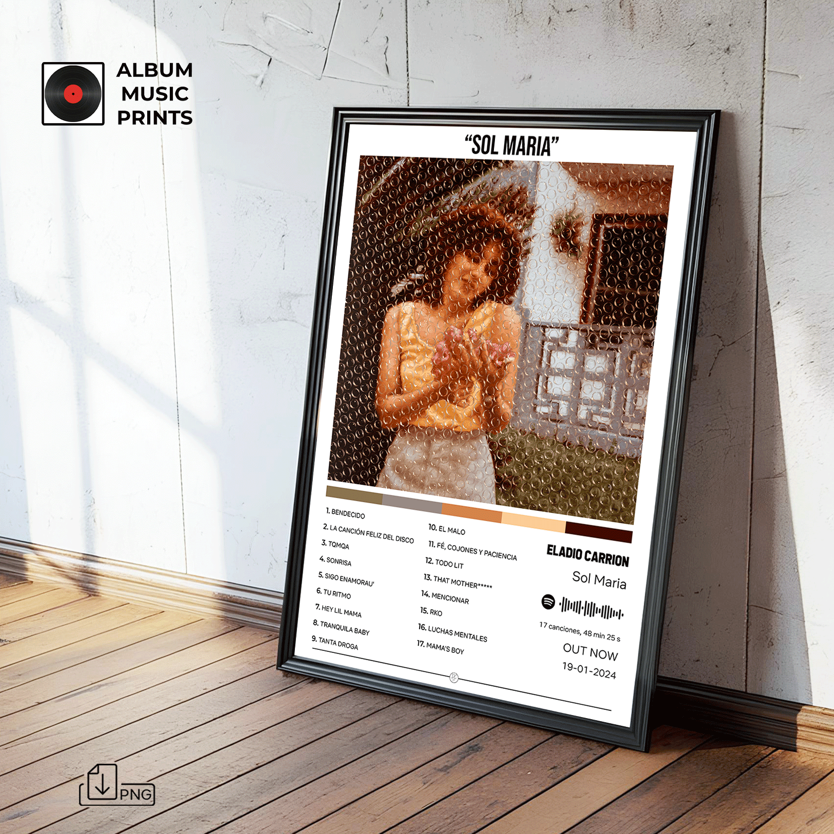 Transforma tu espacio con este impresionante póster digital inspirado en el álbum SOL MARIA de Eladio Carrión. Diseño urbano y contemporáneo que captura la esencia del trap latino y el estilo único de uno de los artistas más influyentes de la nueva generación del género urbano.