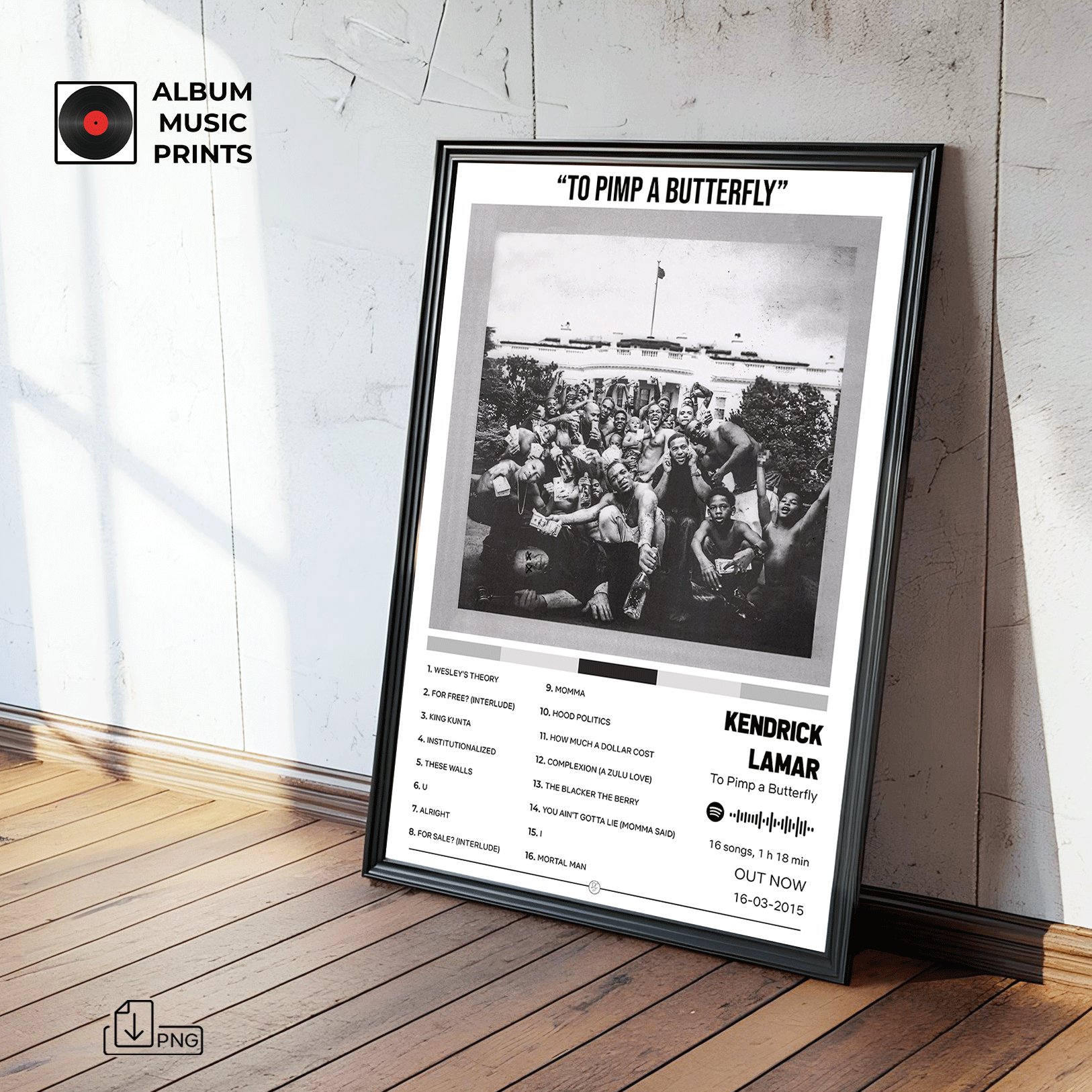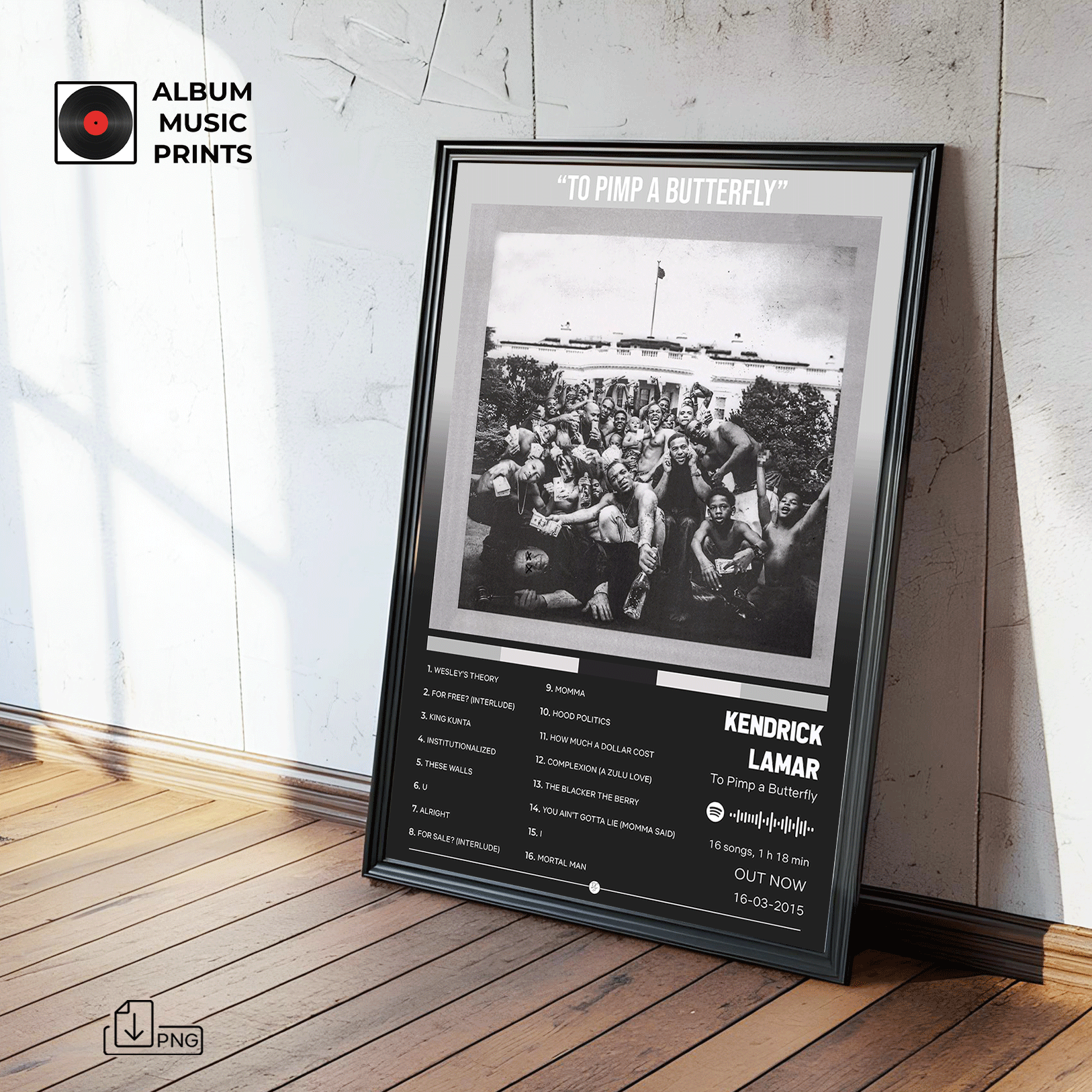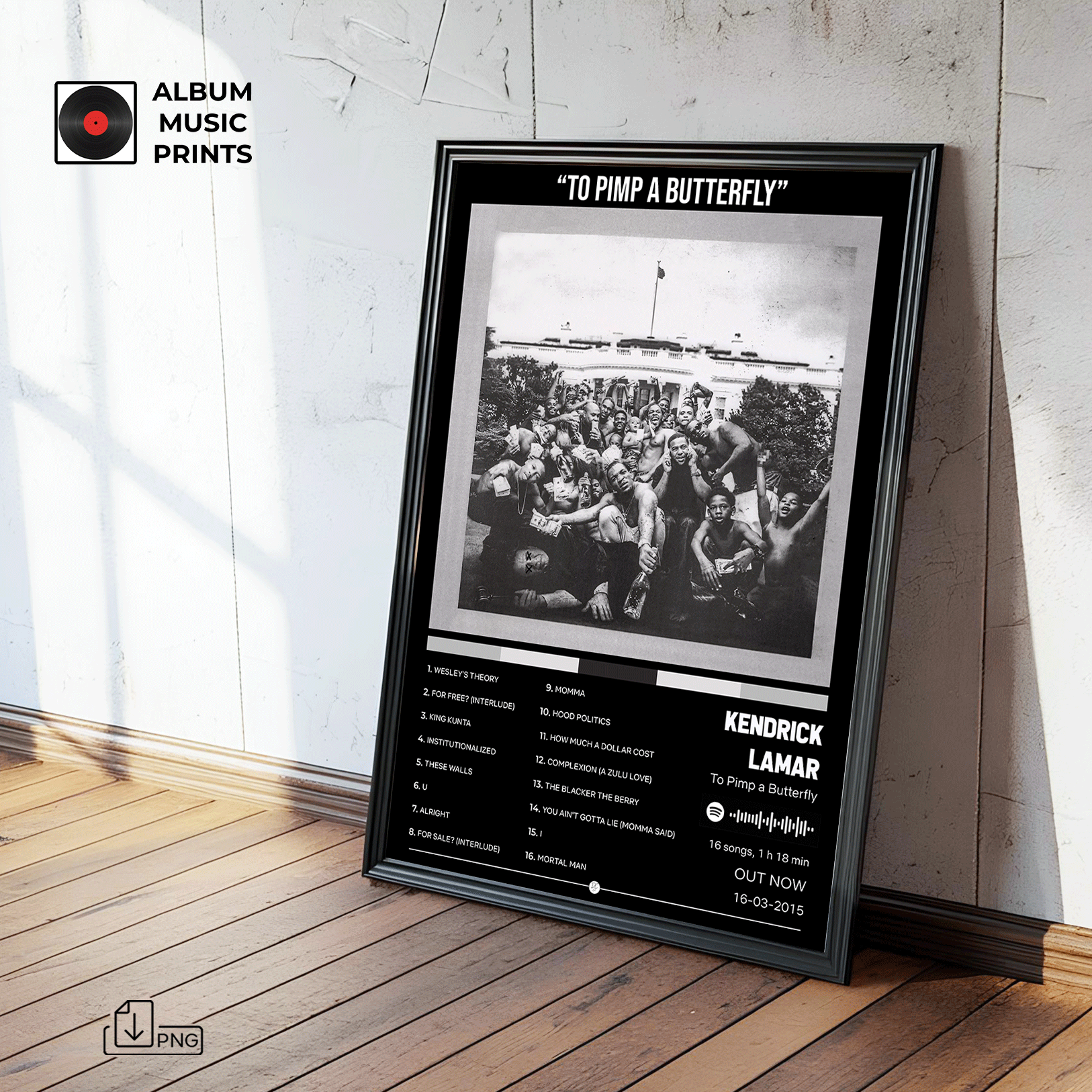Descarga el póster digital del revolucionario álbum To Pimp a Butterfly de Kendrick Lamar, una obra maestra del jazz-rap que transformó el hip-hop moderno. Este álbum conceptual fusiona funk, soul y jazz con letras profundas sobre identidad, raza y sociedad, presentando tracks icónicos como Alright, King Kunta, The Blacker the Berry y These Walls.