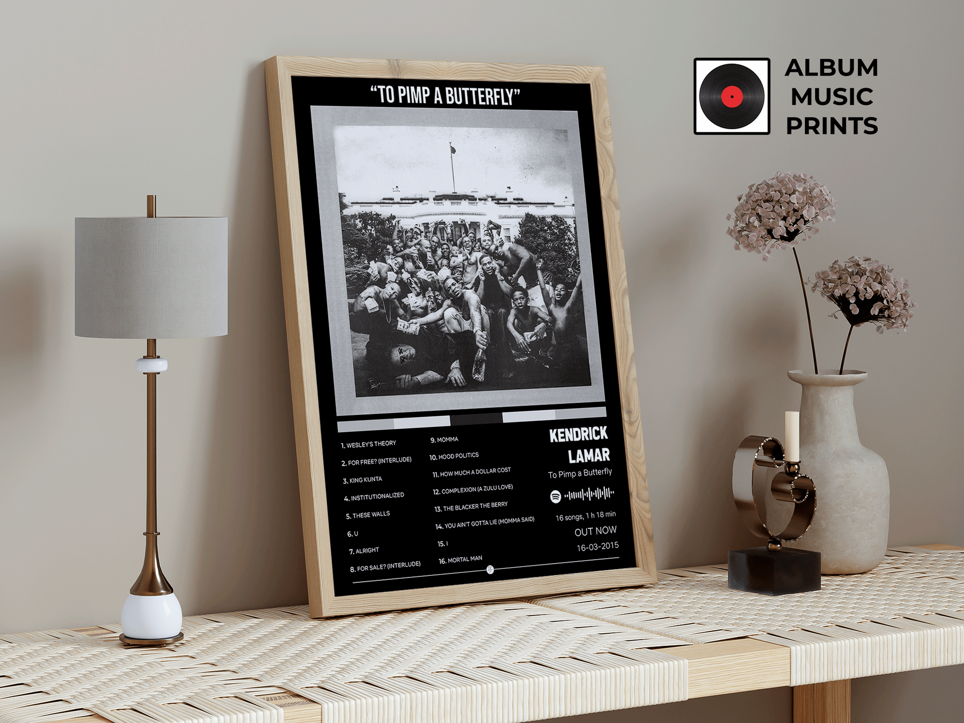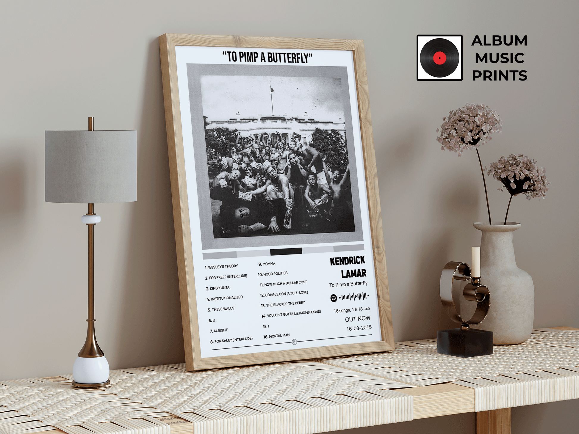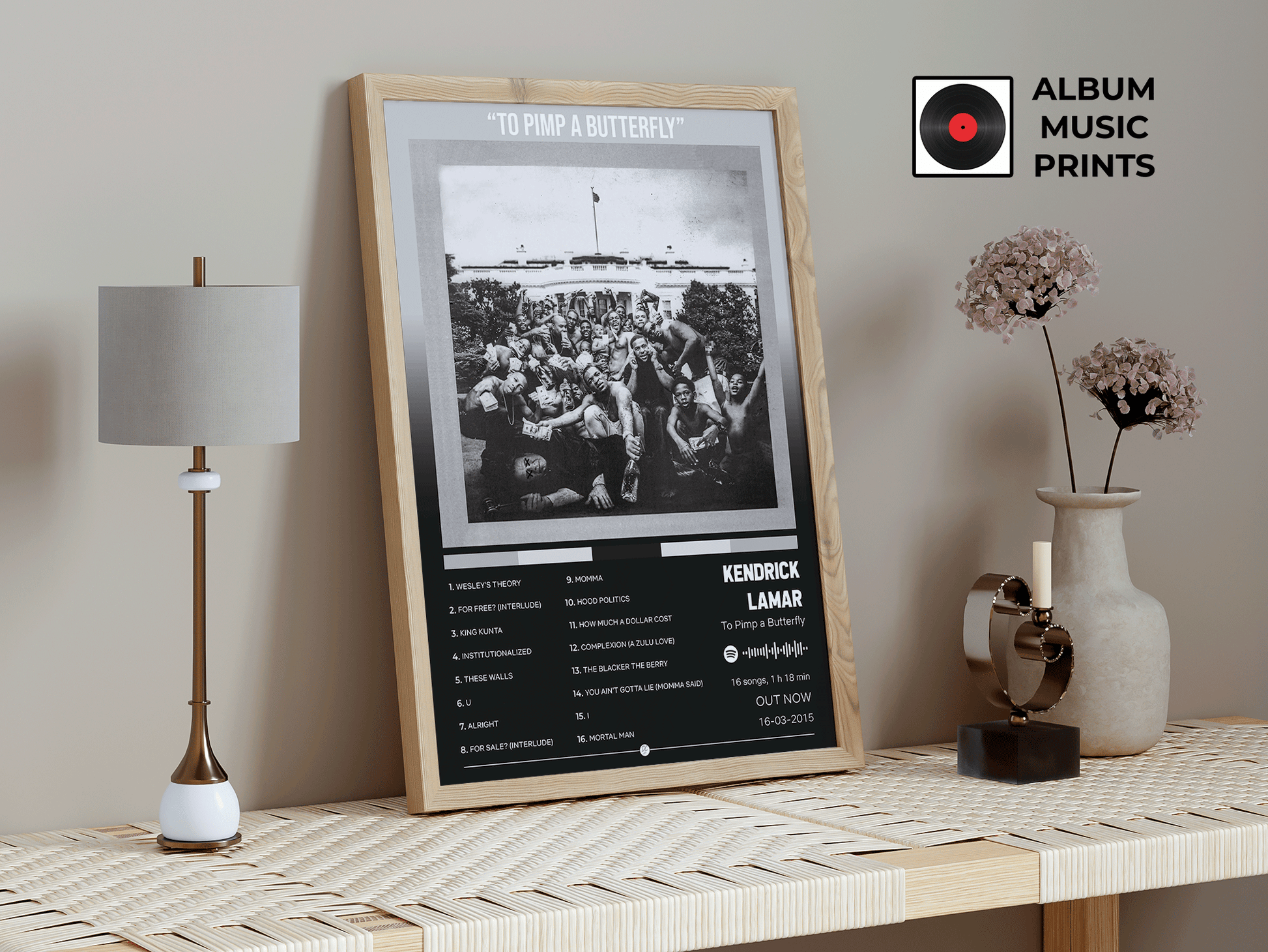 Descarga el póster digital del revolucionario álbum To Pimp a Butterfly de Kendrick Lamar, una obra maestra del jazz-rap que transformó el hip-hop moderno. Este álbum conceptual fusiona funk, soul y jazz con letras profundas sobre identidad, raza y sociedad, presentando tracks icónicos como Alright, King Kunta, The Blacker the Berry y These Walls.