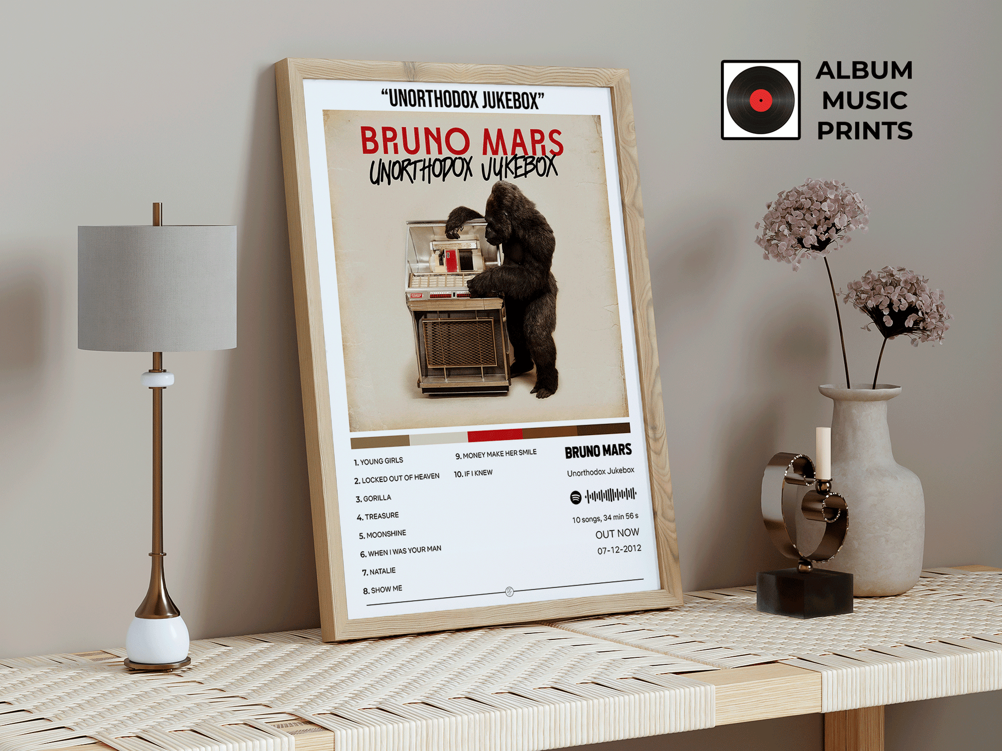Transforma tu espacio con este espectacular póster digital inspirado en el aclamado álbum Unorthodox Jukebox de Bruno Mars. Diseño vibrante y ecléctico que captura la esencia del funk, soul, pop y R&B de uno de los álbumes más premiados de la década.