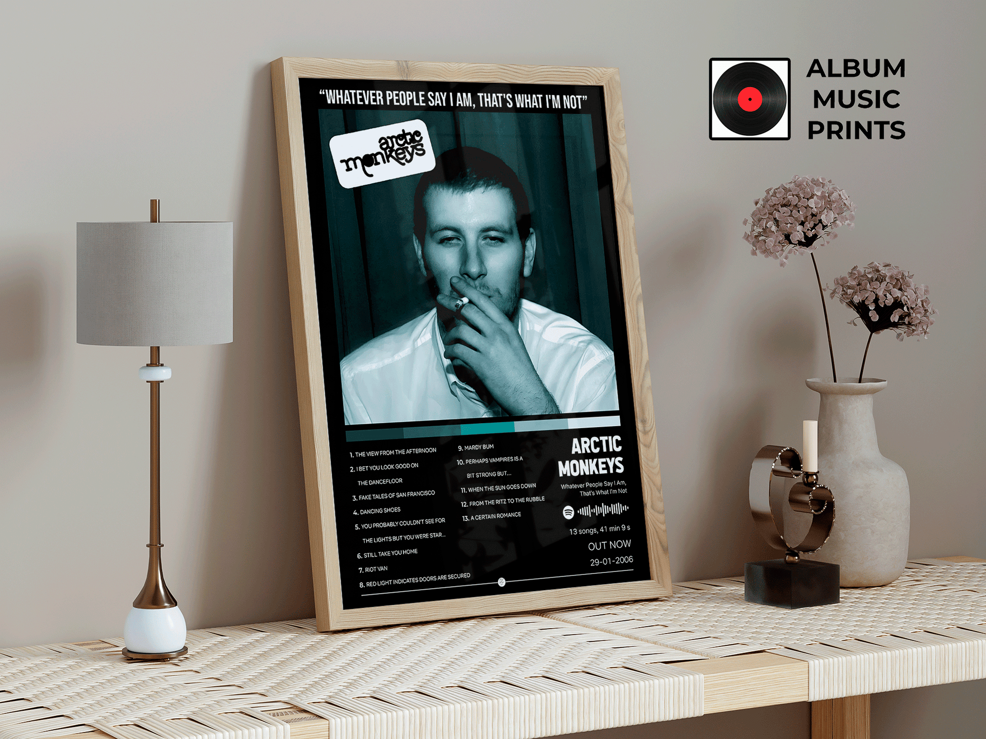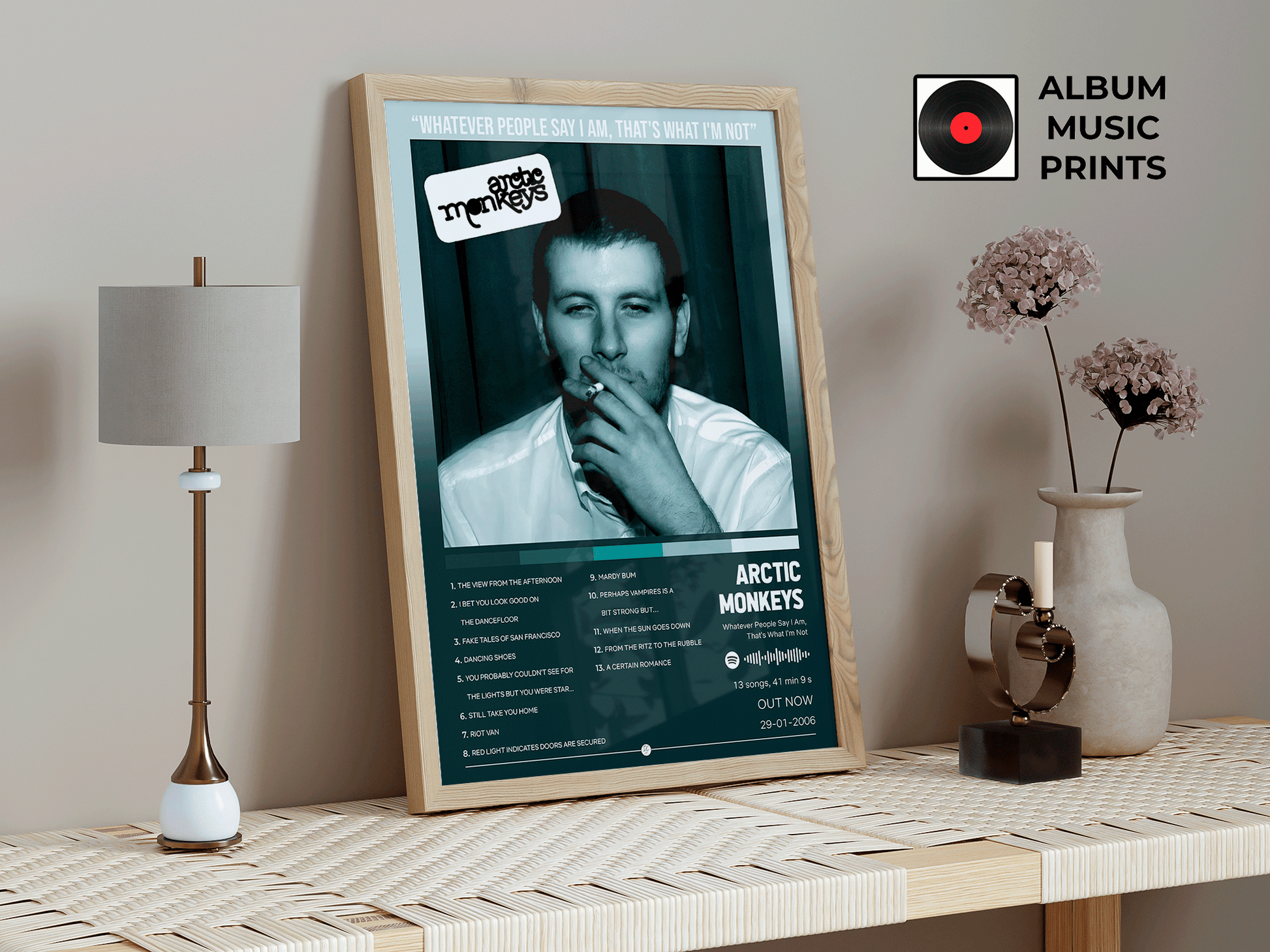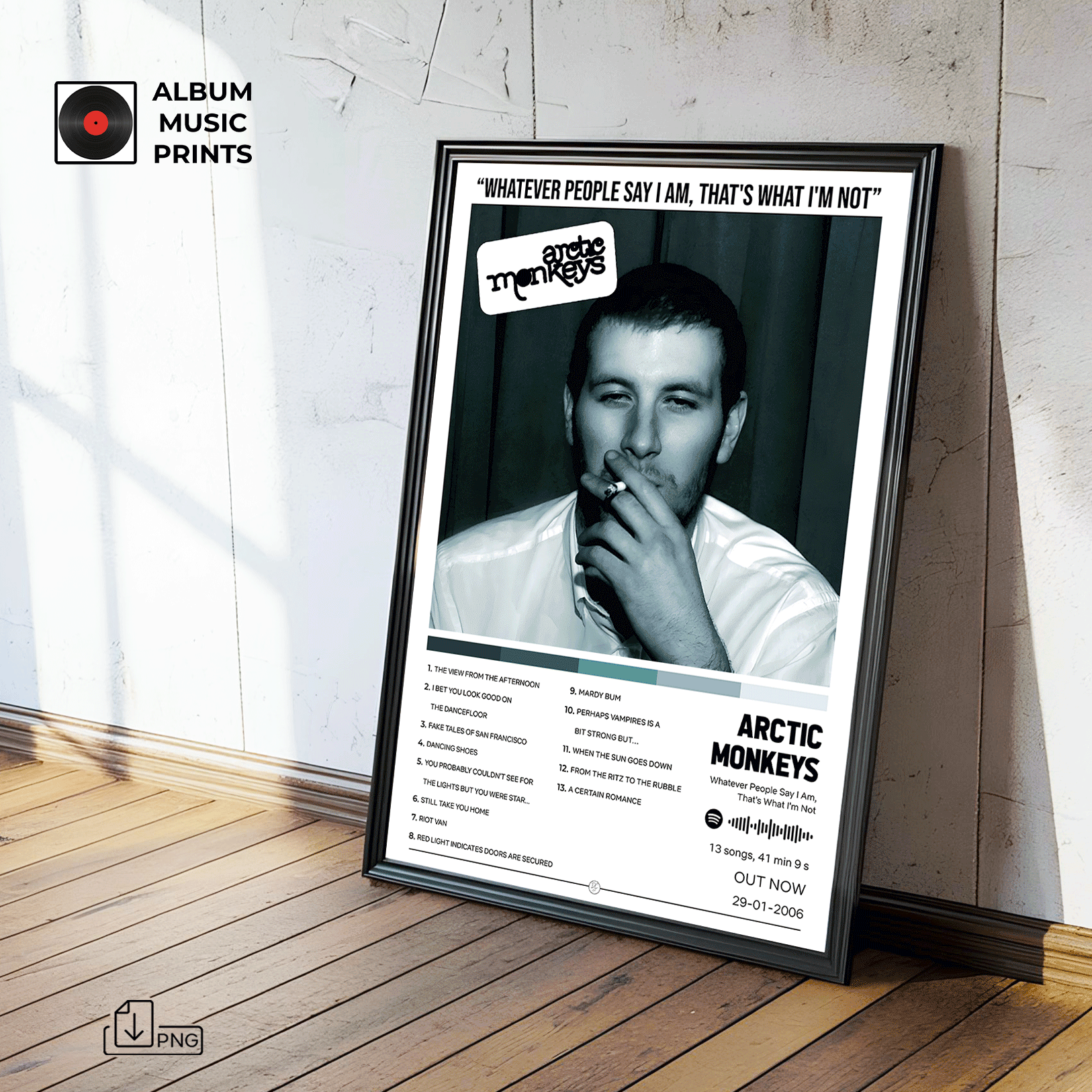 Considerado uno de los mejores álbumes debut de todos los tiempos, este diseño captura la esencia cruda y auténtica del indie rock de Sheffield. Perfecto para fanáticos del rock alternativo, música británica y quienes buscan decorar su espacio con arte musical legendario y nostálgico.