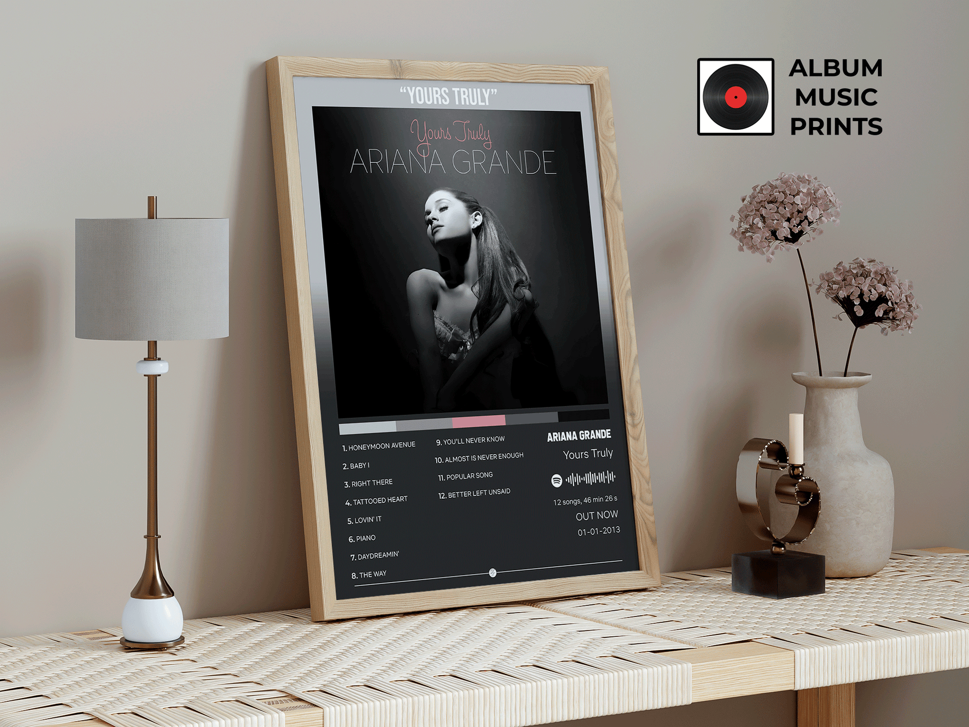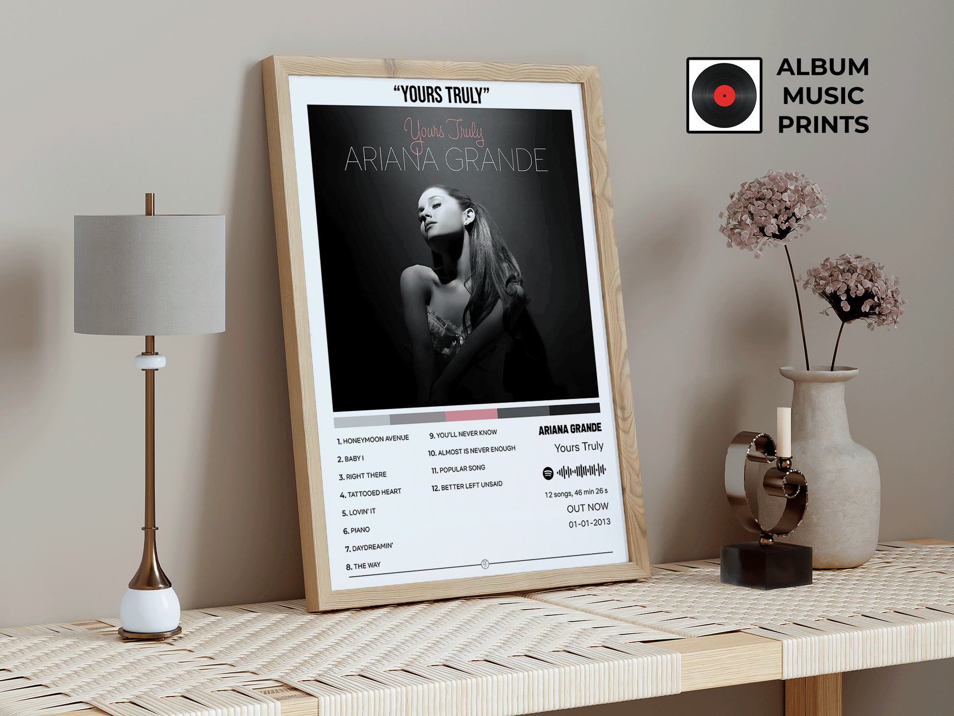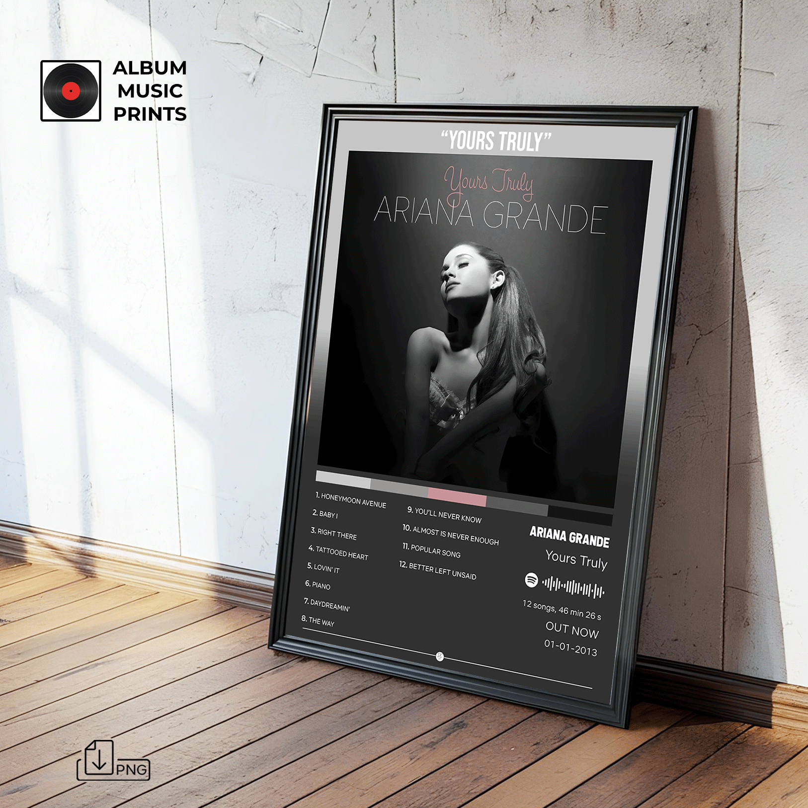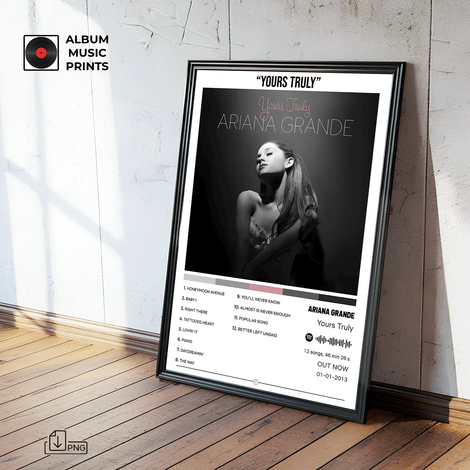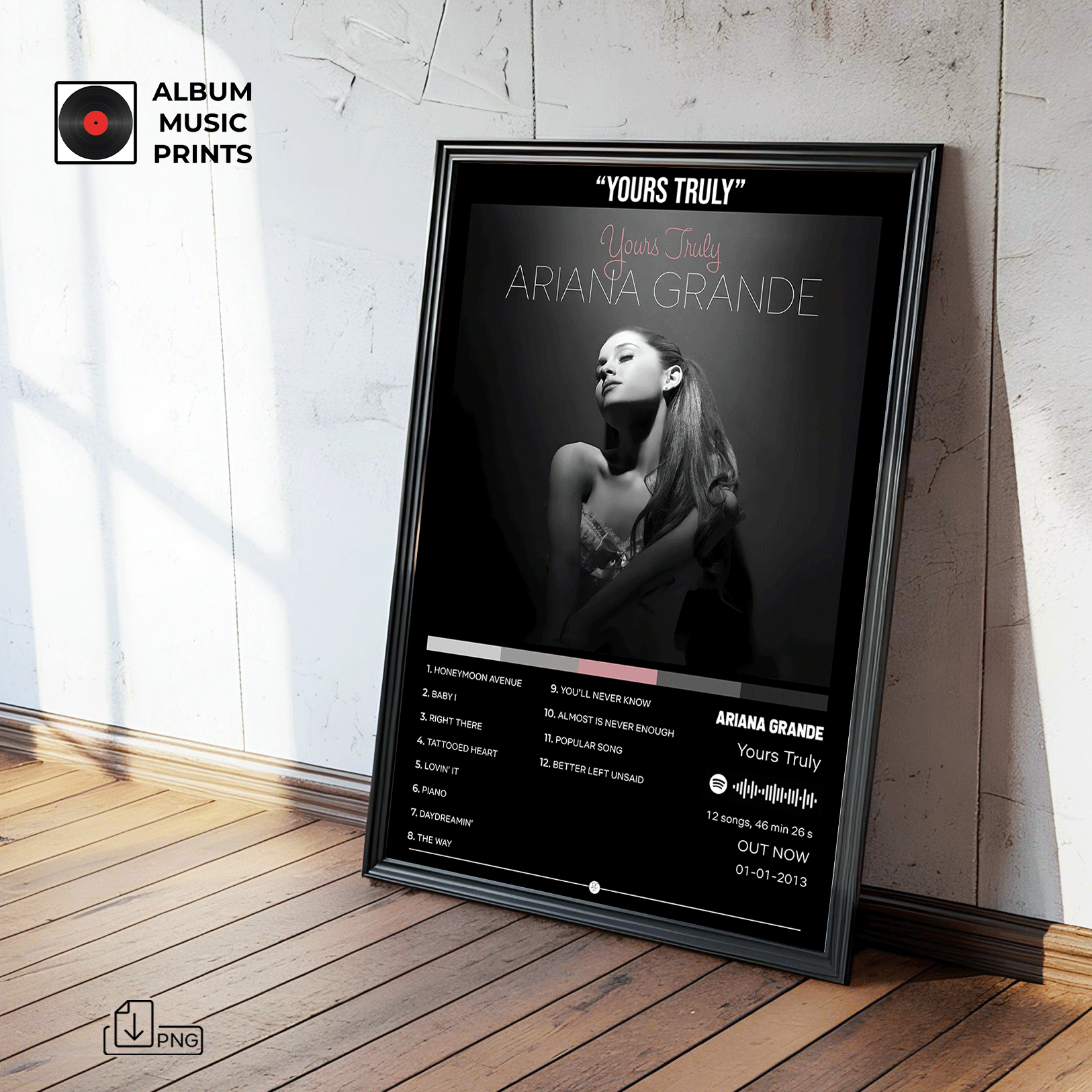 Descarga instantánea del póster digital del álbum Yours Truly de Ariana Grande. Diseño exclusivo de alta calidad, perfecto para decorar tu espacio con el arte visual de uno de los álbumes más icónicos de la música pop contemporánea.