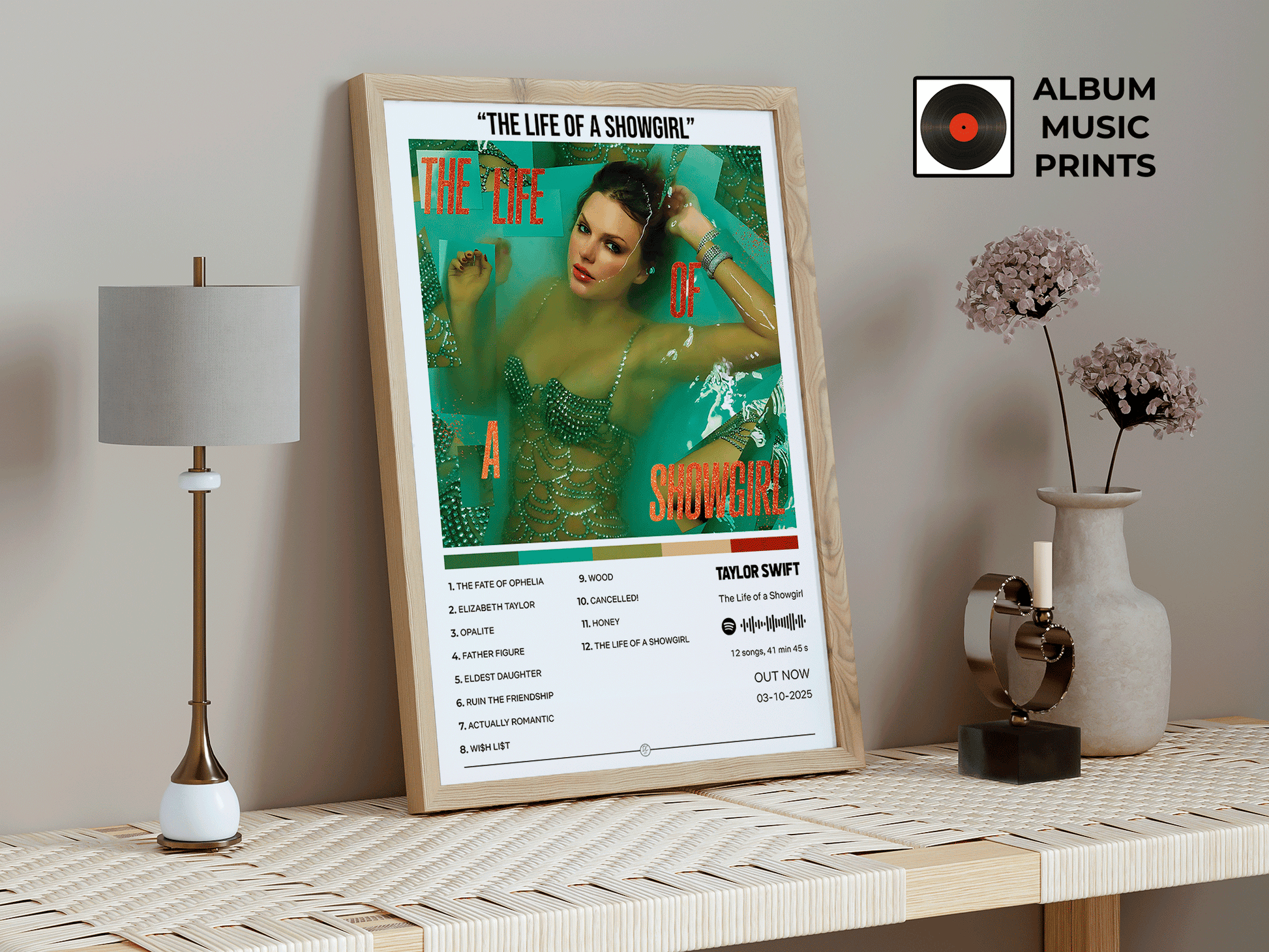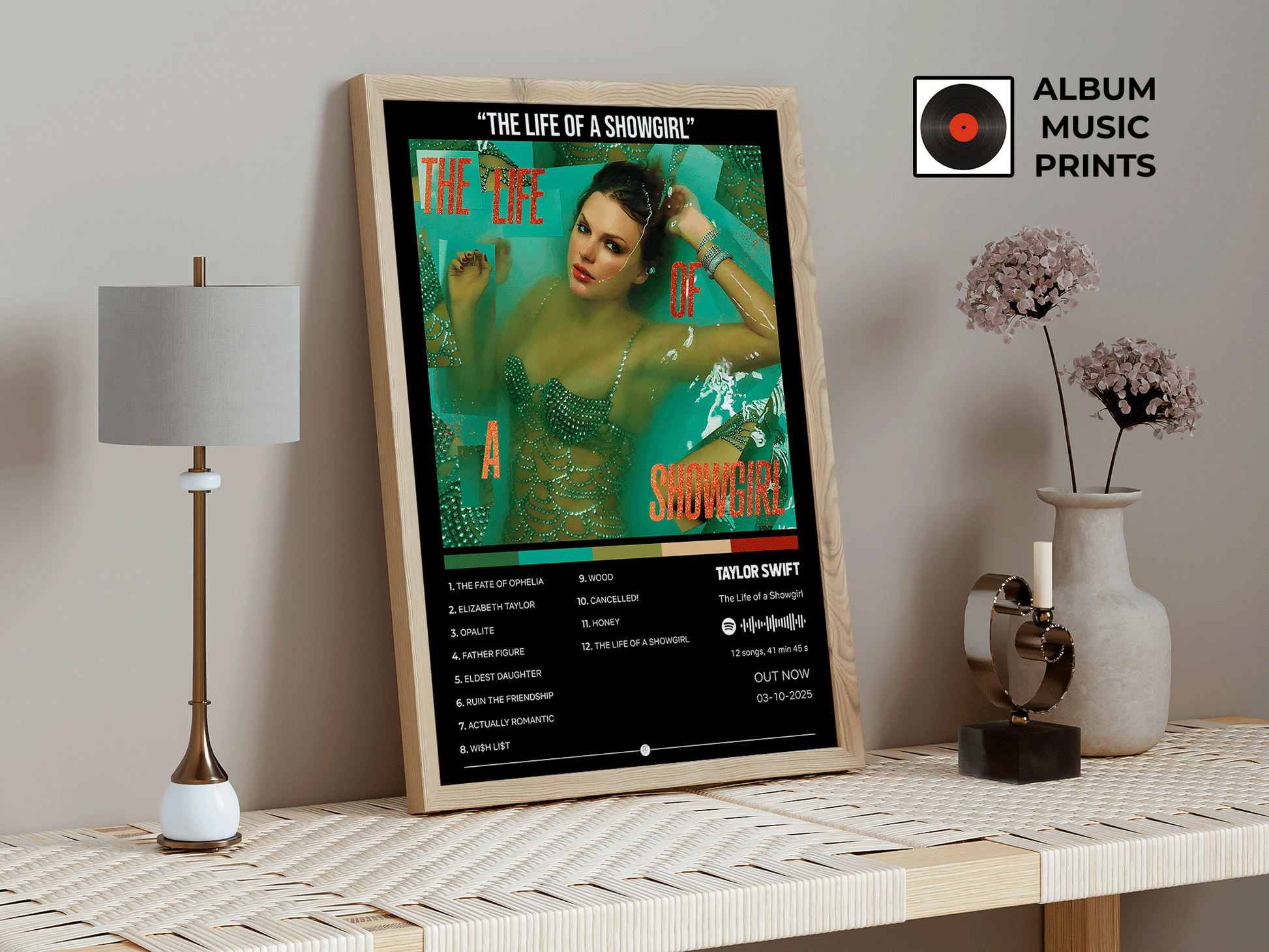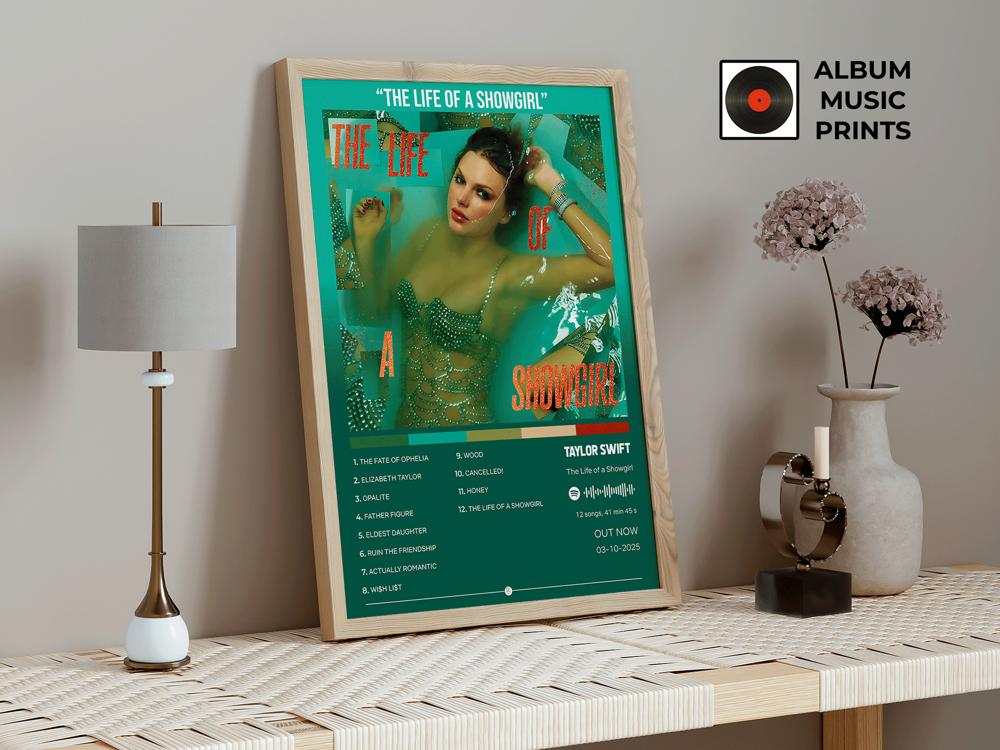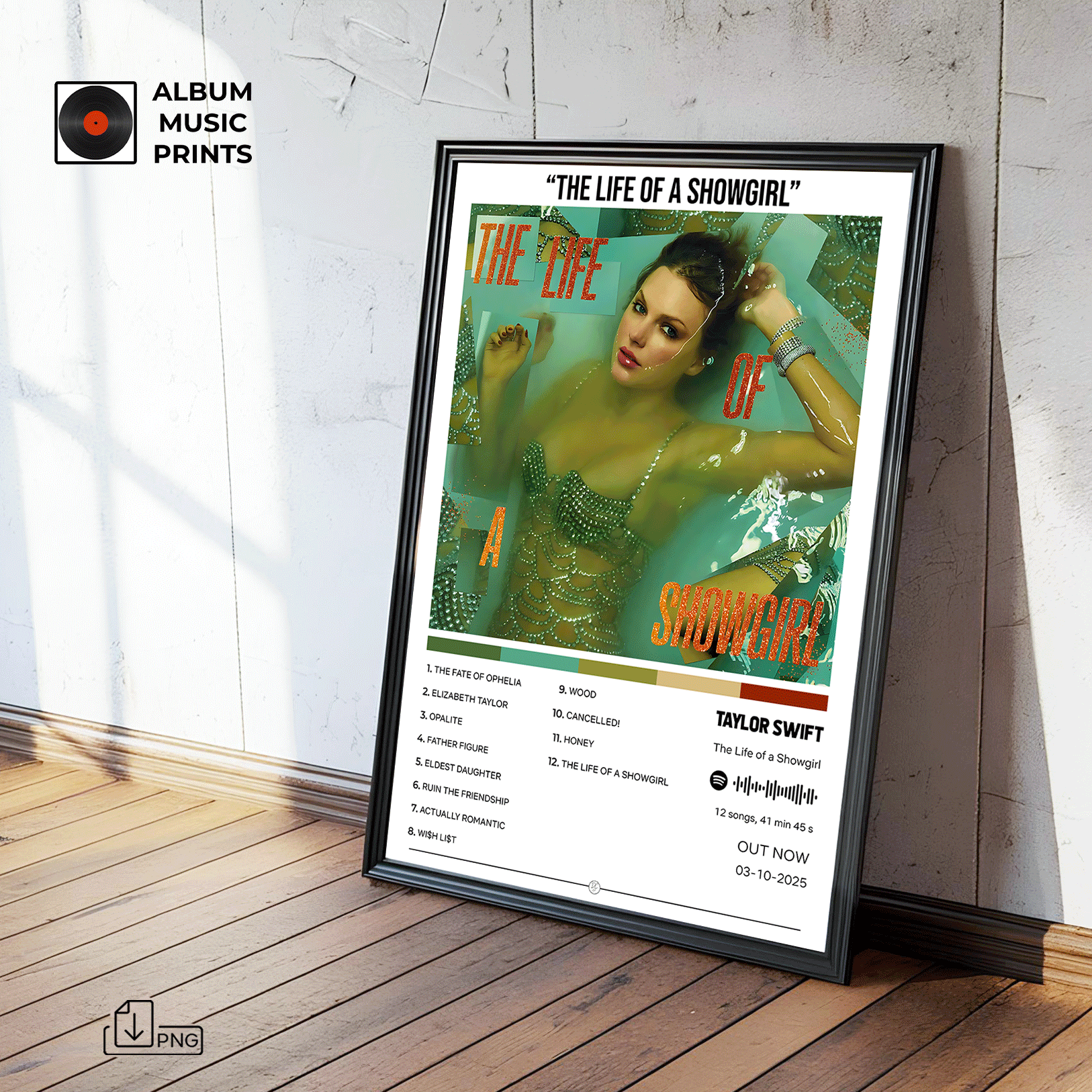 Descarga instantánea del póster digital del álbum The Life of a Showgirl de Taylor Swift. Diseño exclusivo de alta calidad listo para imprimir y decorar tu espacio con el arte musical de una de las artistas más icónicas del pop y country.