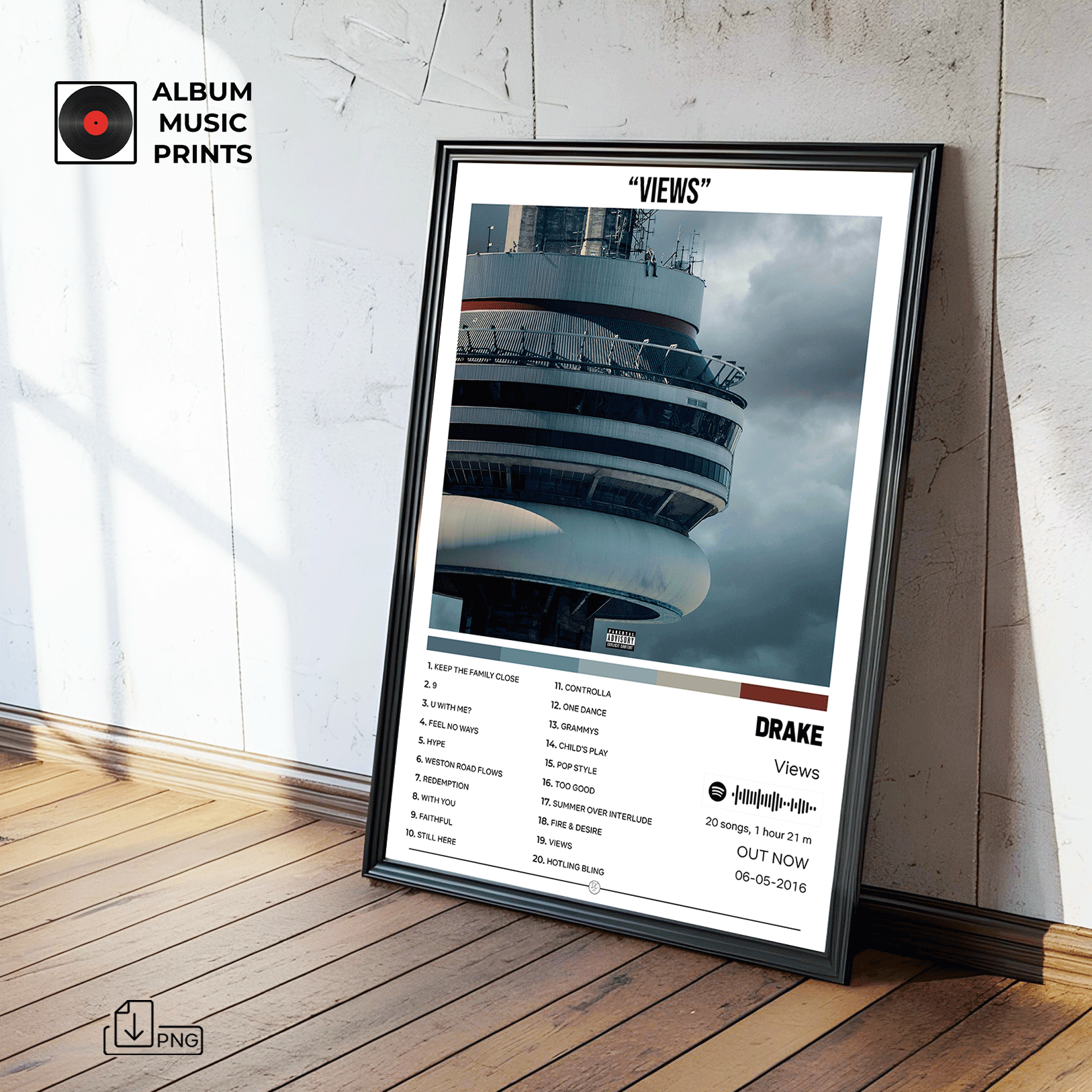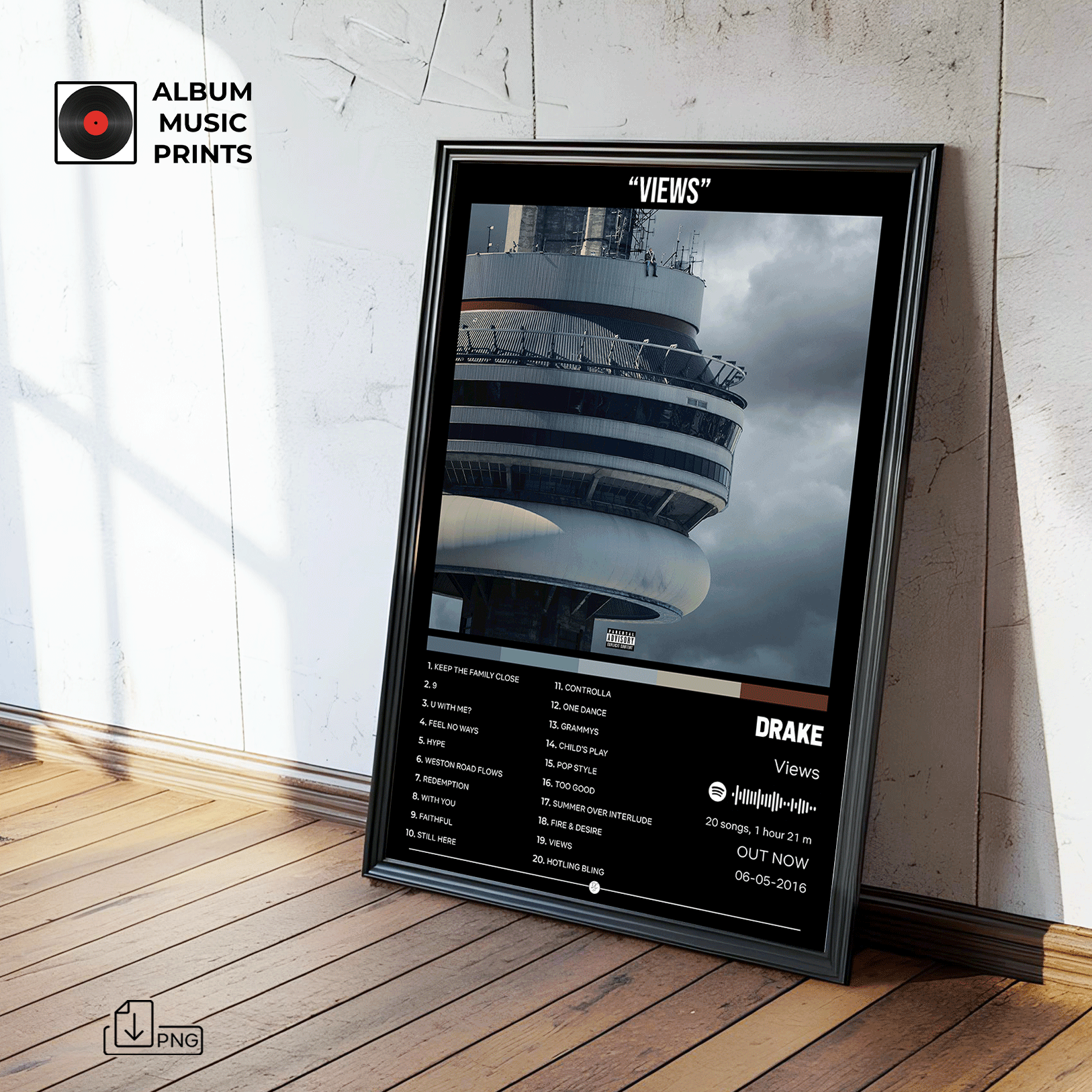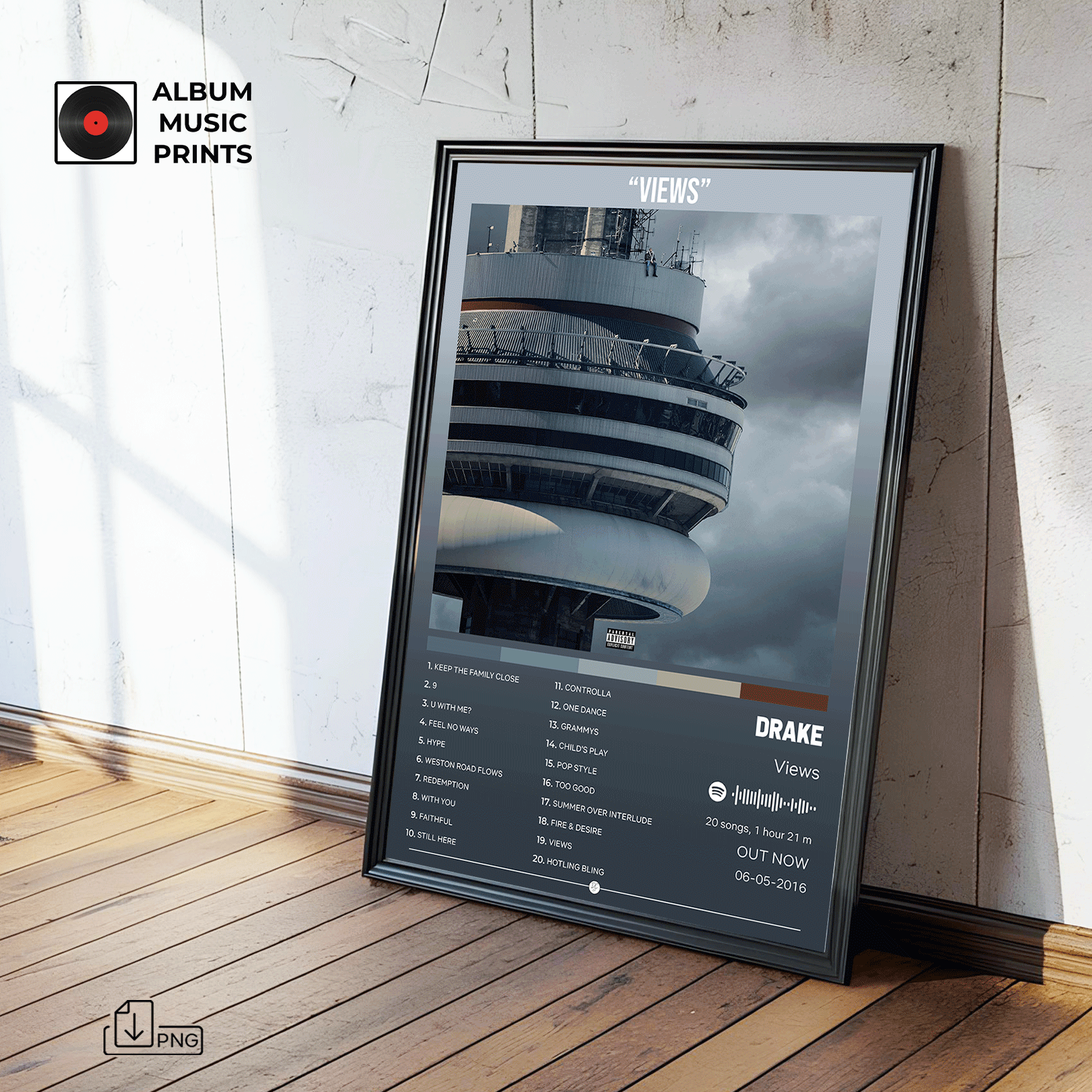Descarga instantánea del diseño digital del icónico álbum Views de Drake. Este poster captura la esencia del cuarto álbum de estudio del artista canadiense, lanzado en 2016, que incluye hits como "One Dance", "Hotline Bling", "Controlla", "Too Good" y "Child's Play".