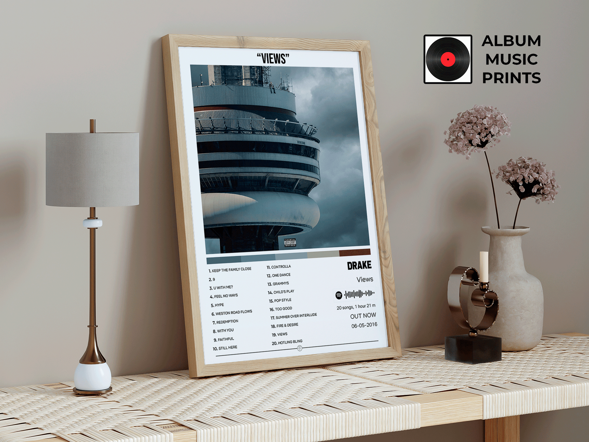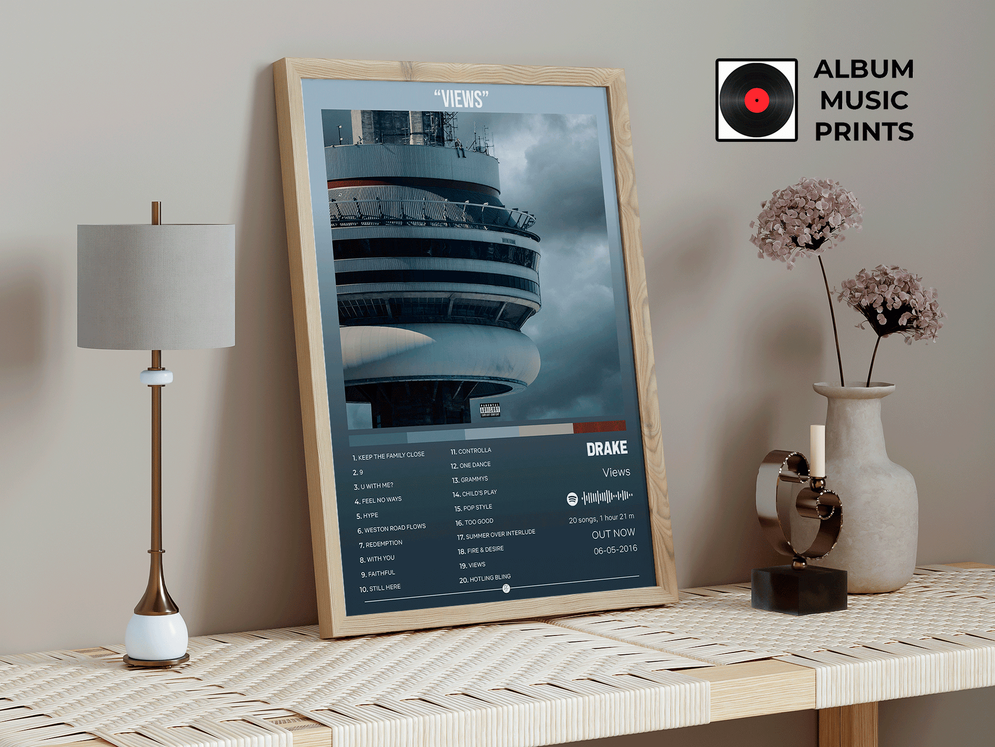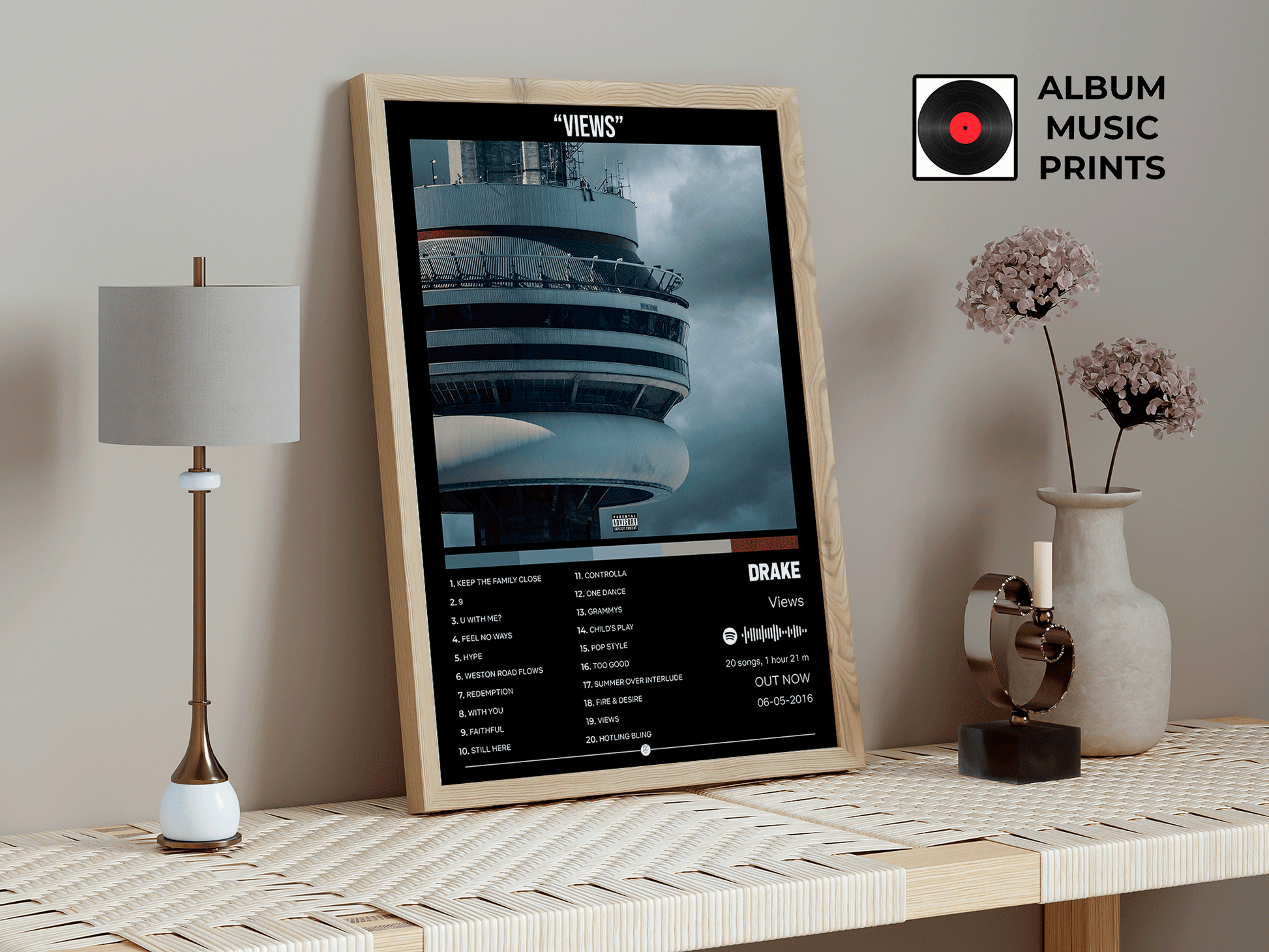 Descarga instantánea del diseño digital del icónico álbum Views de Drake. Este poster captura la esencia del cuarto álbum de estudio del artista canadiense, lanzado en 2016, que incluye hits como "One Dance", "Hotline Bling", "Controlla", "Too Good" y "Child's Play".